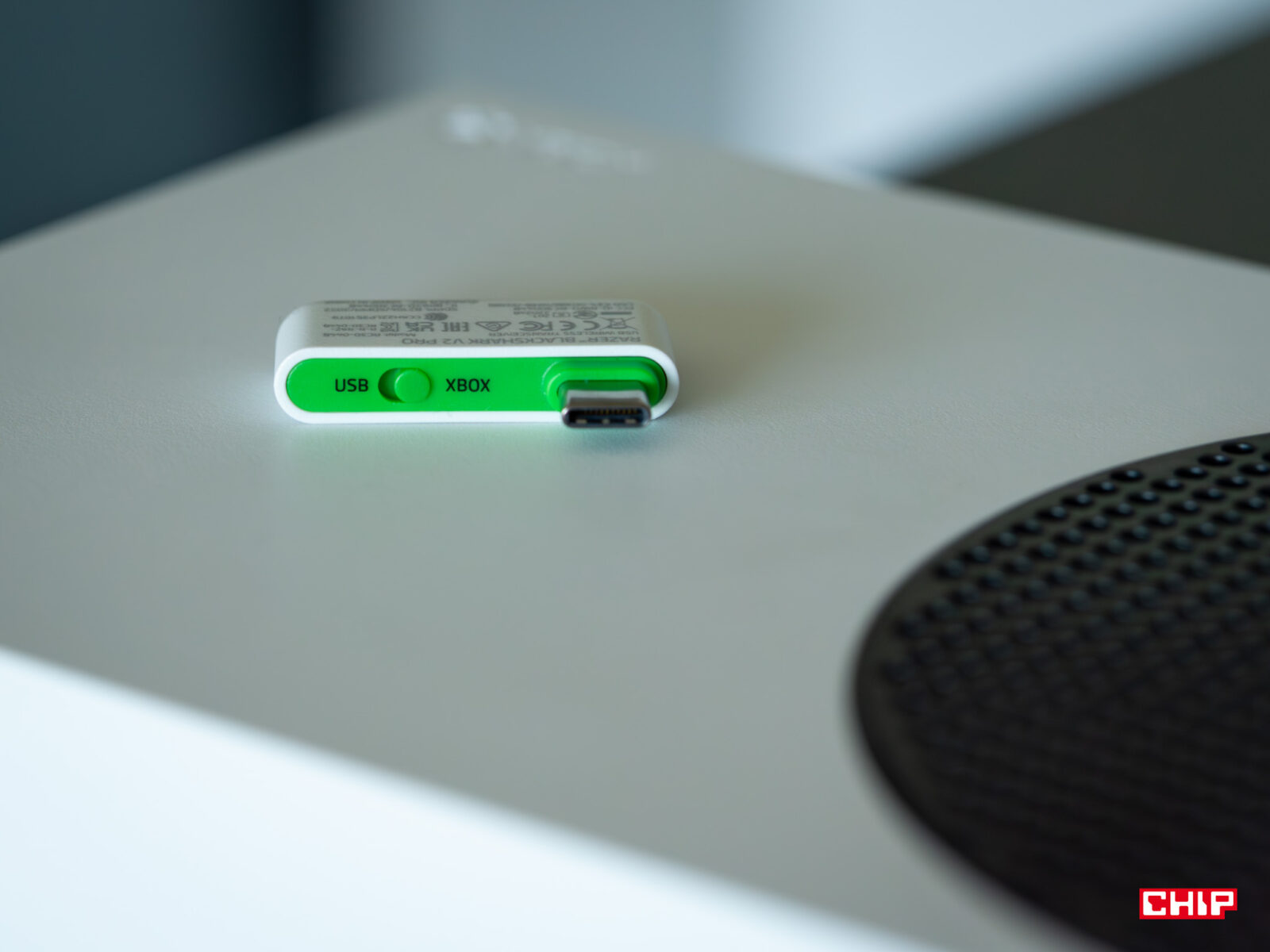 Słuchawki przyszły do mnie w zgrabnym i dobrze zabezpieczonym pianką od środka pudełku, z którego wyjąłem dodatkowo odłączany mikrofon z gniazdem minijack 3,5 mm, kabel USB-A na USB-C do ładowania baterii słuchawek i niewielki adapter USB-C do połączenia radiowego na częstotliwości 2,4 GHz, któremu towarzyszy drugi kabel w charakterze przejściówki na USB-A oraz przedłużki. Jej obecność dziwić nie powinna, albowiem w odróżnieniu od Sony PlayStation 5 żadna z obecnych generacji konsol Microsoftu nie ma na wyposażeniu USB typu C. Sam adapter ma niewielki przełącznik, zmieniający tryb pracy (Xbox i USB, który domyślnie powinien obsługiwać również pecety, smartfony, tablety i przenośne konsole do gier – przez Bluetooth lub port USB-C).