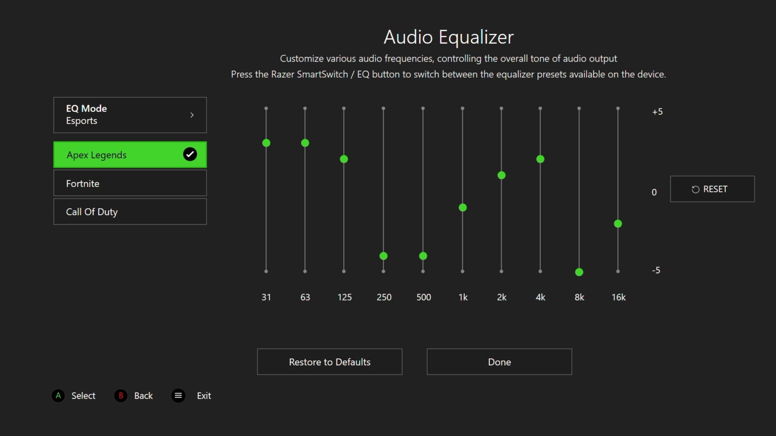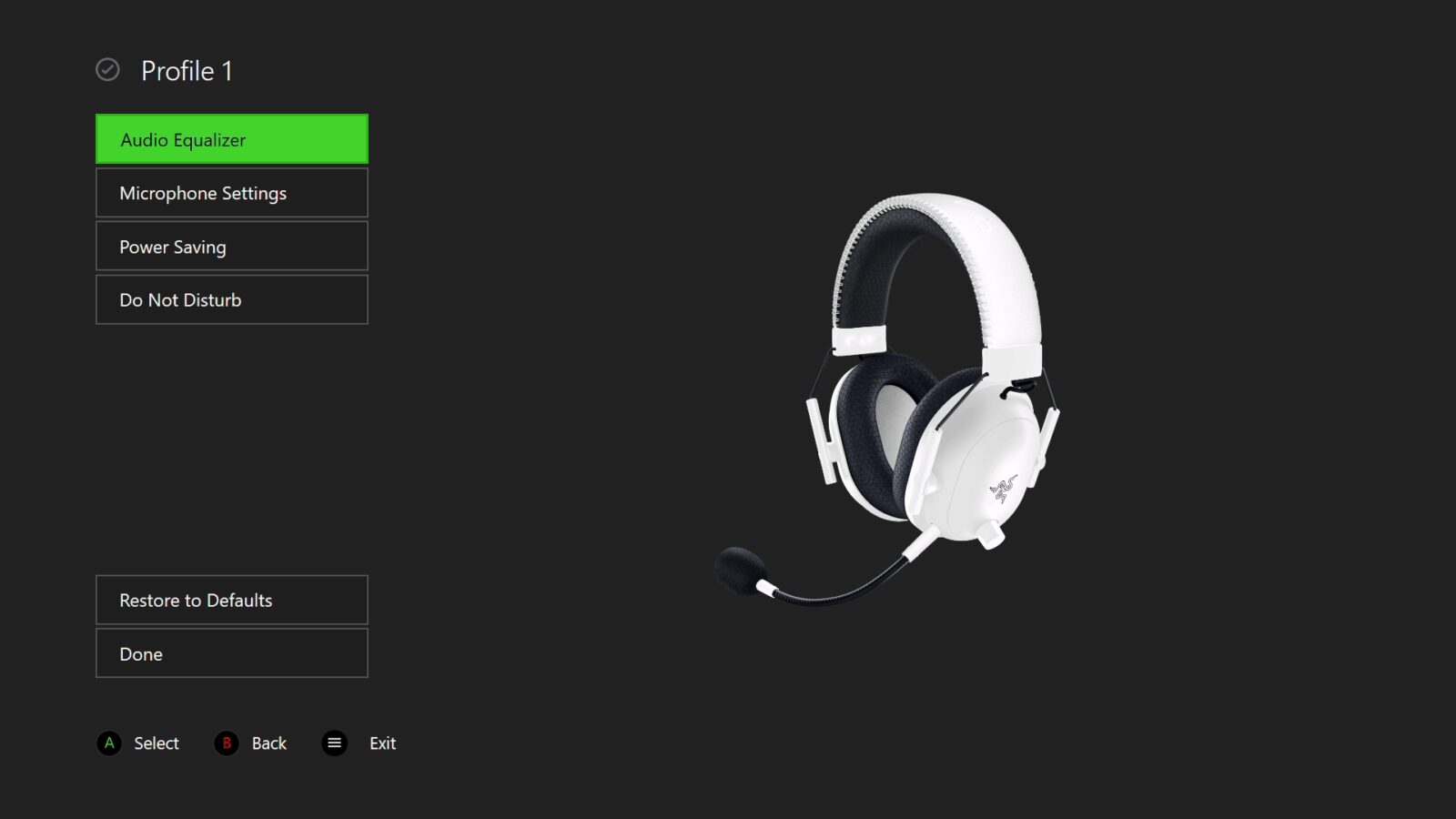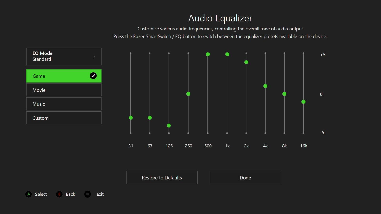 Rzućmy teraz okiem na dodatkowe oprogramowanie, dzięki któremu łatwiej steruje się parametrami pracy słuchawek Razer Blackshark V2 Pro dla Xboksa. Z poziomu konsoli Microsoftu można pobrać ze sklepu darmową i stosunkowo prostą w obsłudze aplikację Razer Audio Setup for Xbox. Znajdziemy w niej ustawienia dla dwóch trybów pracy equalizera, mikrofonu, oszczędzania energii i na dokładkę tryb “nie przeszkadzać”. Sporo dzieje się w pierwszym module, który oferuje tryb standardowy z trzema predefiniowanymi ustawieniami (gra, muzyka, film) i presetem custom dla własnych ustawień oraz tryb gamingowy, do którego producent zapakował trzy presety dla konkretnych tytułów (Apex Legend, Fortnite i Call of Duty). Polecam jednak eksperymentować i szukać swojego ulubionego brzmienia na własną rękę.