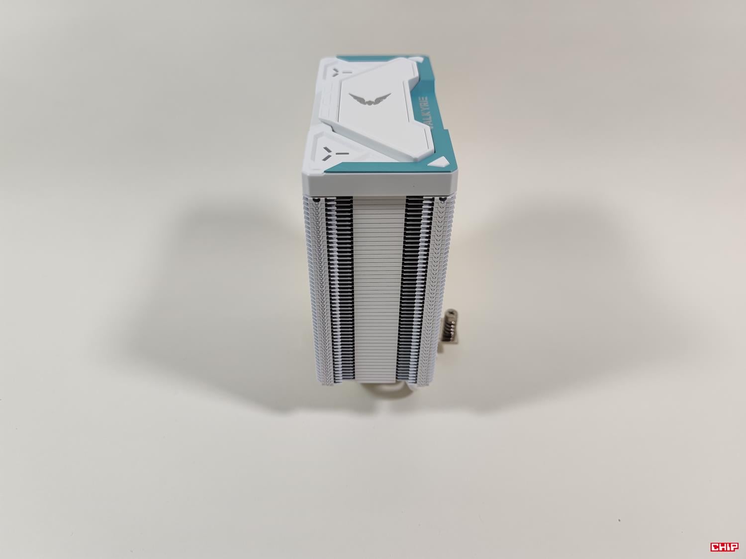 Jakość wykonania jest bardzo dobra z jednym minusem. Białe finy są dobrej jakości i nie wyginają się podczas montażu wentylatorów. Ciepłowody są również białe, a na podstawce mamy nałożoną pastę. Minusem jest mocowanie górnej nakładki. Bardzo łatwo ona wypada z miejsca i jak przypadkiem ją złapiecie i ściągniecie, to pod nią jest pasek LED do niczego nie przymocowany. Ponowny montaż jest więc irytujący, ale jak całość zamontujecie w obudowie to możecie o tym zapomnieć. Plus za to na górną część z logiem Valkyrie – jest ona mocowana na magnes i możecie ją zamienić choćby na tą dołączoną do zestawu. Za chłodzenie odpowiada też sześć 6 mm ciepłowodów, a sama podstawka wykonana jest na lustro.