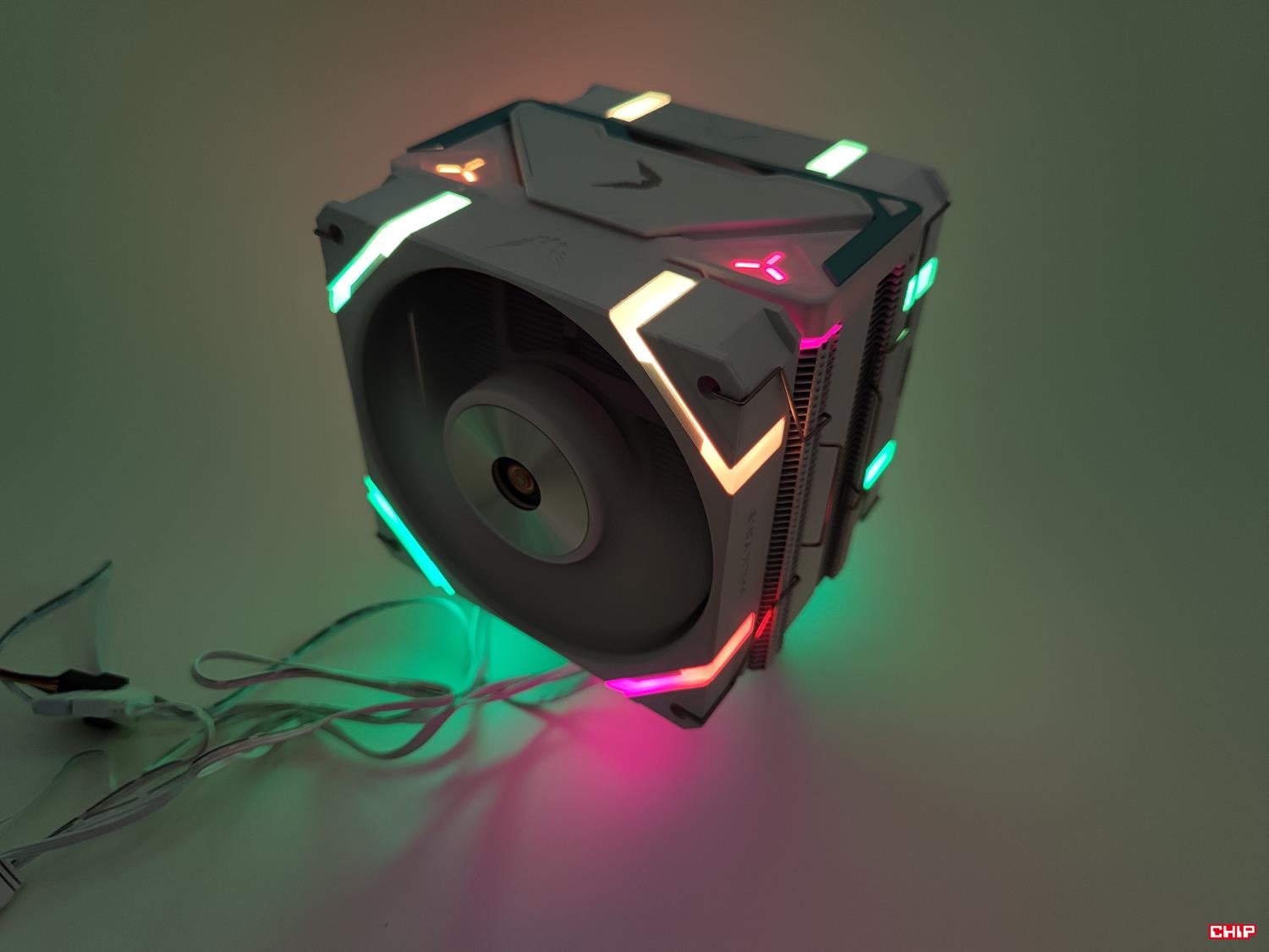 Radaitor z wentylatorami nie jest duży, nie nachodzi na pamięci RAM i zmieści się w większości typowych obudów. Plus za właśnie kompaktowe rozmiary, ale ma to wpływ na wydajność. Pamiętajcie też, że tylny wentylator może nachodzić na sekcję zasilania. Jakość wykonania jest ogólnie bardzo dobra – jedynie mocowanie górnej nakładki mogło by być lepsze. Sam wygląd to zdecydowany plus – wersja biała z podświetleniem prezentuje się naprawdę świetnie.