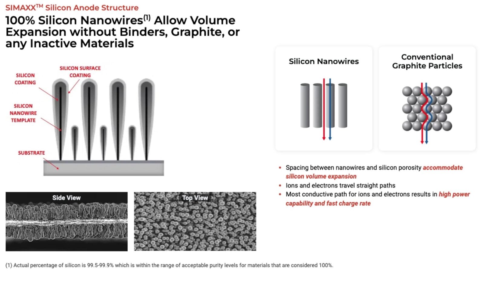 W praktyce ogniwa SiMaxx wykorzystują unikalną strukturę nanoprzewodów krzemowych dla anody, zastępując występujący tradycyjne w tym elemencie grafit. Ten innowacyjny projekt pozwala krzemowi pomieścić do dziesięciu razy więcej jonów litu, co w efekcie znacząco zwiększa pojemność energetyczną akumulatora do nawet 500 Wh/kg (waga) i 1300 Wh/kg (objętość). Dodatkowo tego typu struktura nanoprzewodów łagodzi typowe rozszerzenie i kurczenie się podczas cykli ładowania, co z kolei zwiększa trwałość i niezawodność akumulatora. Cechują się też wysokim poziomem bezpieczeństwa, co udowodniły w krytycznych testach bezpieczeństwa, wśród których znalazły się też te wymagane przez wojsko USA.