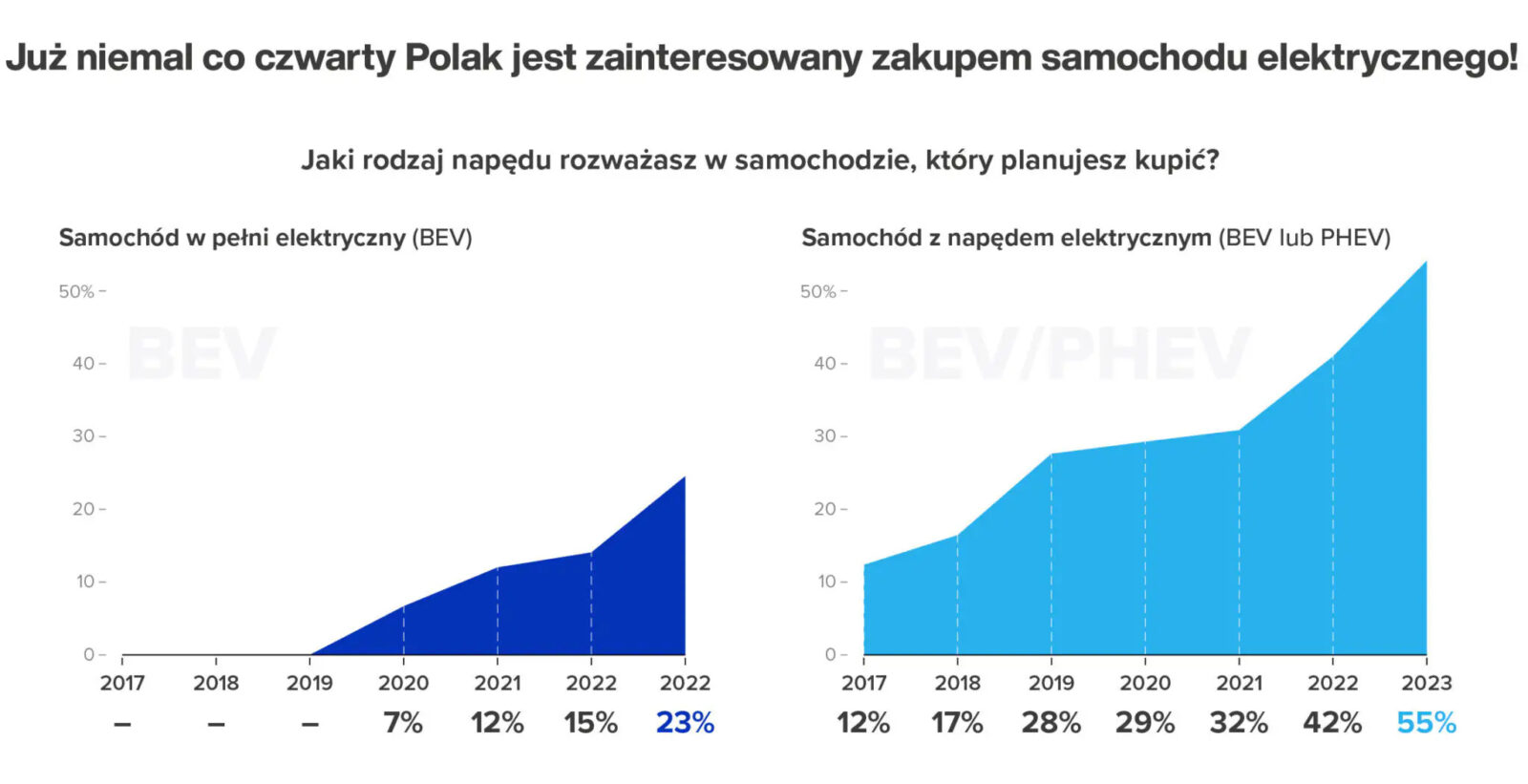 Z raportu dowiadujemy się w pierwszej kolejności, że prawie co czwarty z nas jest zainteresowany kupnem samochodu w pełni elektrycznego (BEV). Tegoroczny wynik 23 proc. jest wyższy o 8 pp. względem 2022 roku. Warto dodać, że jeszcze cztery lata temu kupno elektryka brało pod rozwagę jedynie 7 proc. Polaków. Nie mniej optymistyczne dane dotyczą chęci kupna czy to samochodu w pełni elektrycznego (BEV), czy z napędem elektrycznym (PHEV). Tutaj zainteresowanych dla jakiejkolwiek z dwóch opcji było aż 55 proc. respondentów!