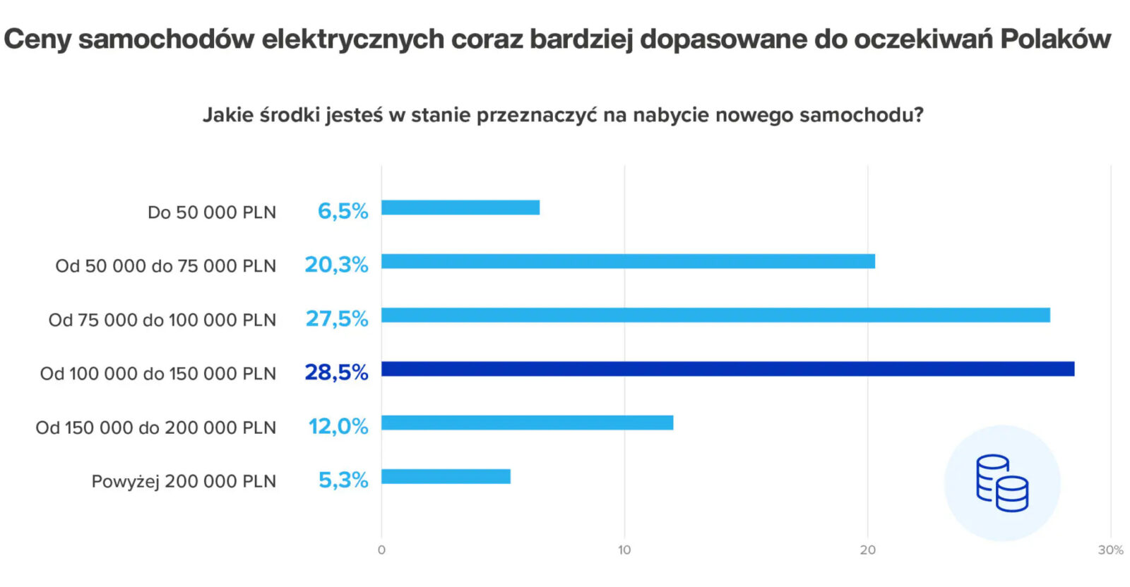 Barometr Nowej Mobilności zbadał również zasobność portfeli Polaków pod względem kupna ewentualnego samochodu elektrycznego. Najwięcej ankietowanych (28,5 proc.) odpowiedziało, że przeznaczyłoby na ten cel od 100 do 150 tysięcy złotych. Sumując przedziały kwotowe, możemy zobaczyć, że niewiele ponad połowa Polaków (54 proc.) wolałoby wydać na elektryka nie więcej niż 100 tysięcy złotych, a tylko 5 proc. – ponad 200 tysięcy.