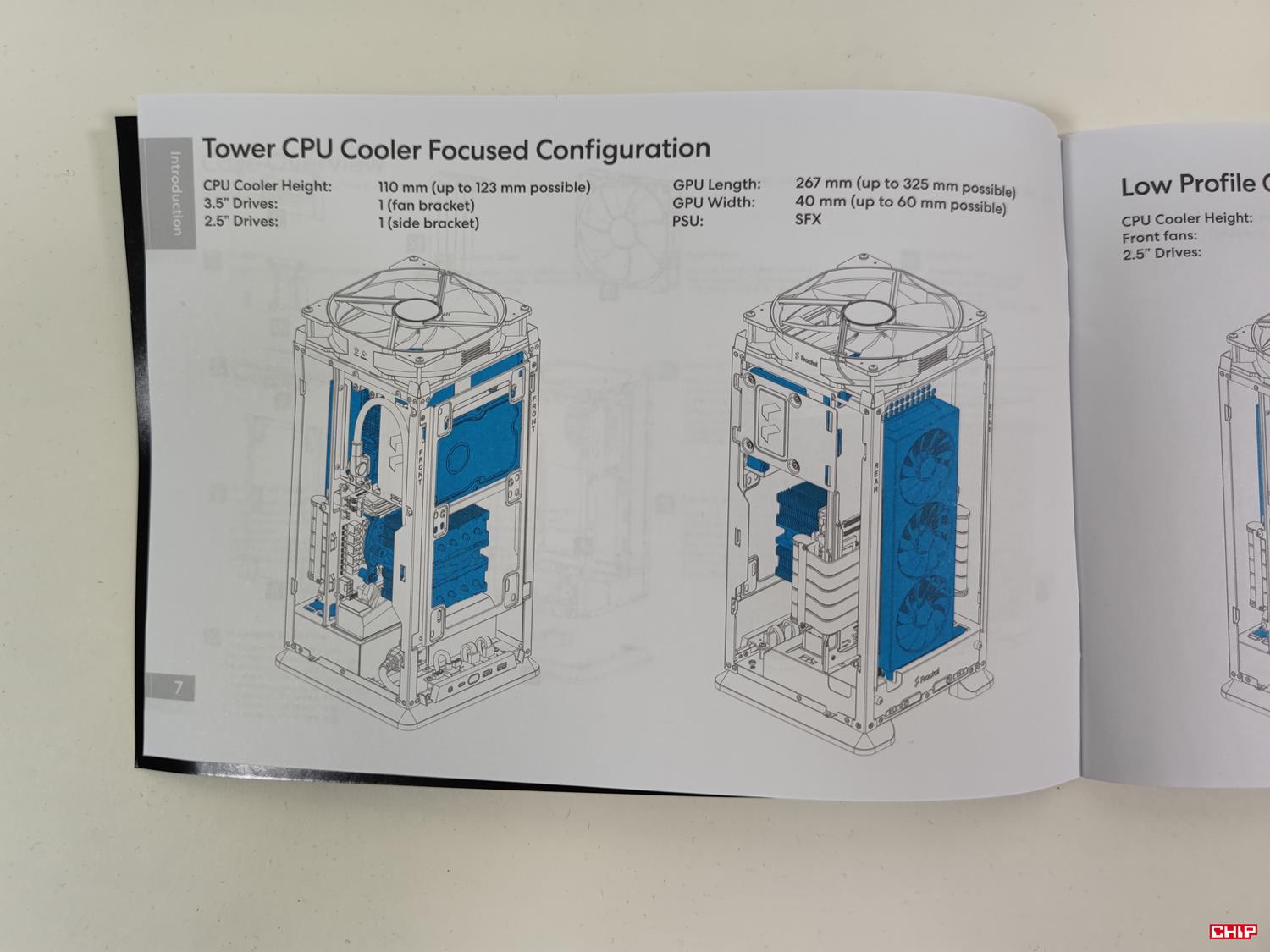 W najbardziej wydajnej opcji zmieścicie AiO do 280 mm oraz kartę graficzną o naprawdę sporych rozmiarach. Pamiętajcie też, że obudowa obsługuje tylko zasilacze SFX i SFX-L. Możecie też zawsze zdecydować się na tradycyjne chłodzenie powietrzem, ale tutaj również w zależności od jego wysokości macie różne możliwości montażowe. W zależności od wybranej opcji w obudowie możecie nawet zmieścić dysk 3,5 cala, co zasługuje na uwagę. Przed wyborem podzespołów warto więc zapoznać się z powyższymi zdjęciami i sprawdzić, czy na pewno wszystko uda się zmieścić.