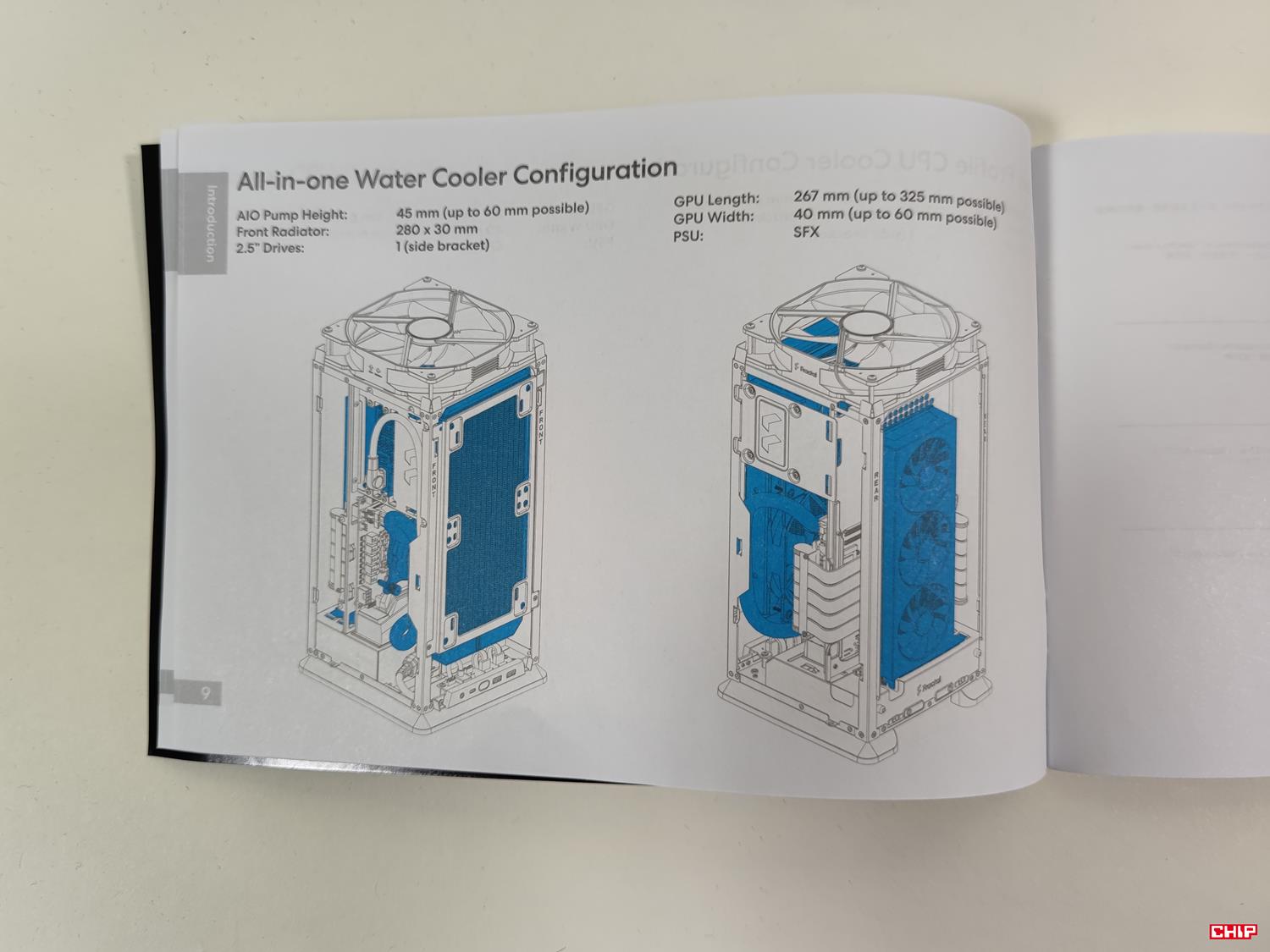 Instrukcja podaje również sporo informacji dotyczących zarządzania okablowaniem. Mamy otwory do ładnego przeciągnięcia części kabli, czy miejsca na opaski. W przypadku buildu z AIO (jak poniżej) jest jednak naprawdę mało miejsca na ułożenie kabli i przed włożeniem chłodnicy najlepiej jest wszystko ogarnąć i na koniec zostawić tylko odpowiednie ułożenie węży. W obudowie jest też riser PCIe 4.0, dzięki któremu możecie podłączyć kartę graficzną. Zaślepki PCI na GPU są dwa i oba przykręcane są na szybkośrubki.