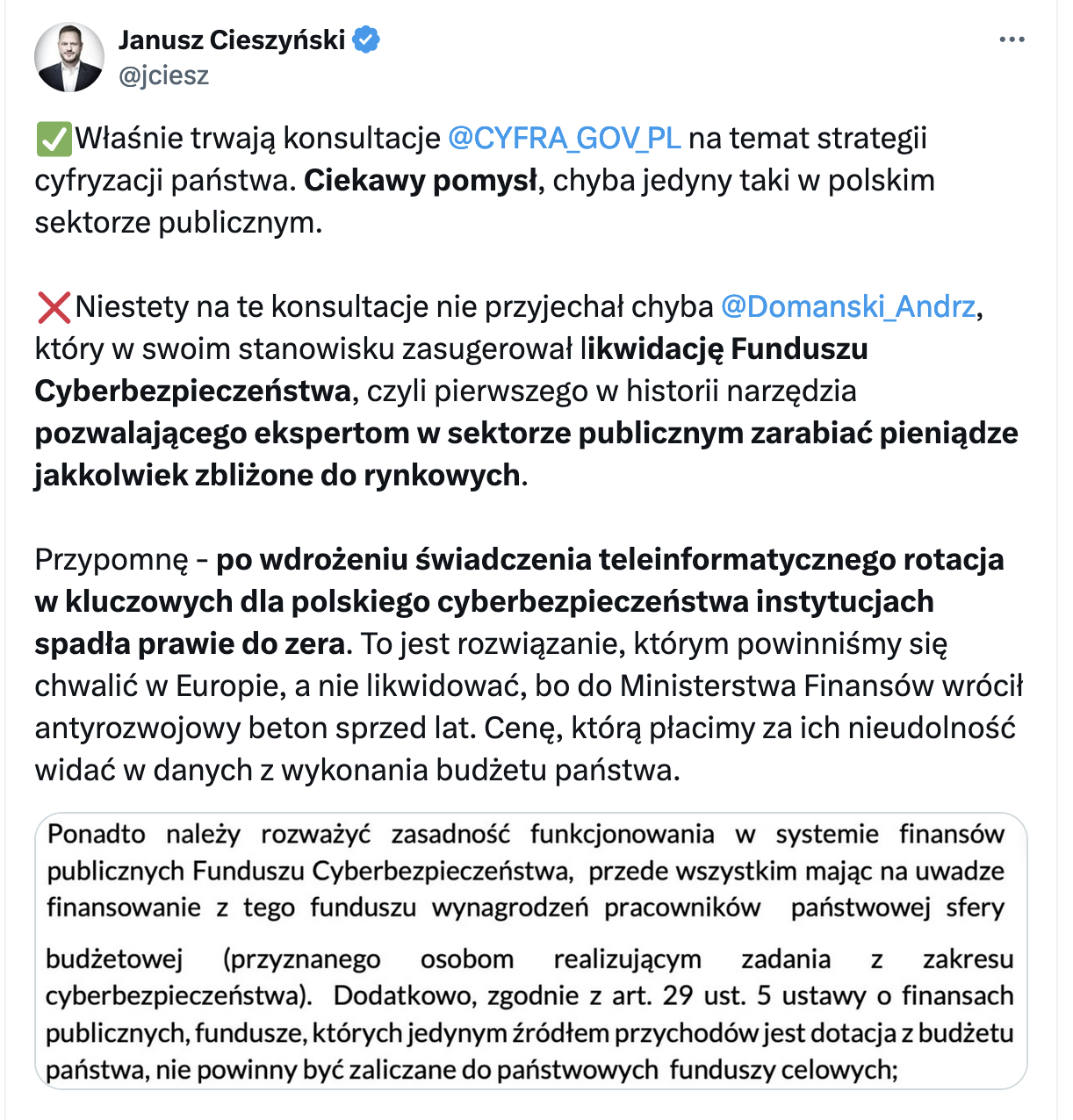 Cyberbezpieczeństwo to w dzisiejszych czasach bardzo ważny temat, choć wiem, że działania kolejnej już władzy przy ustawach w tym zakresie to kabaret, więc warto mieć w tym zakresie solidnych fachowców. Realia rynku są takie, że tych można mieć tylko za odpowiednim, konkurencyjnym względem rynku prywatnego, wynagrodzeniem. Co nie zmienia faktu, że kolejka, która właśnie ustawia się po pieniądze wygląda zabawnie i pewnie, przynajmniej w części z wnioskujących instytucji, być może są one potrzebne. Więc nie zostaje nam nic innego jak mieć nadzieję, że fundusz zostanie utrzymany, a dostępne w nim środki będą mądrze wydane.