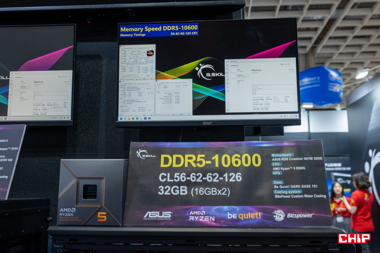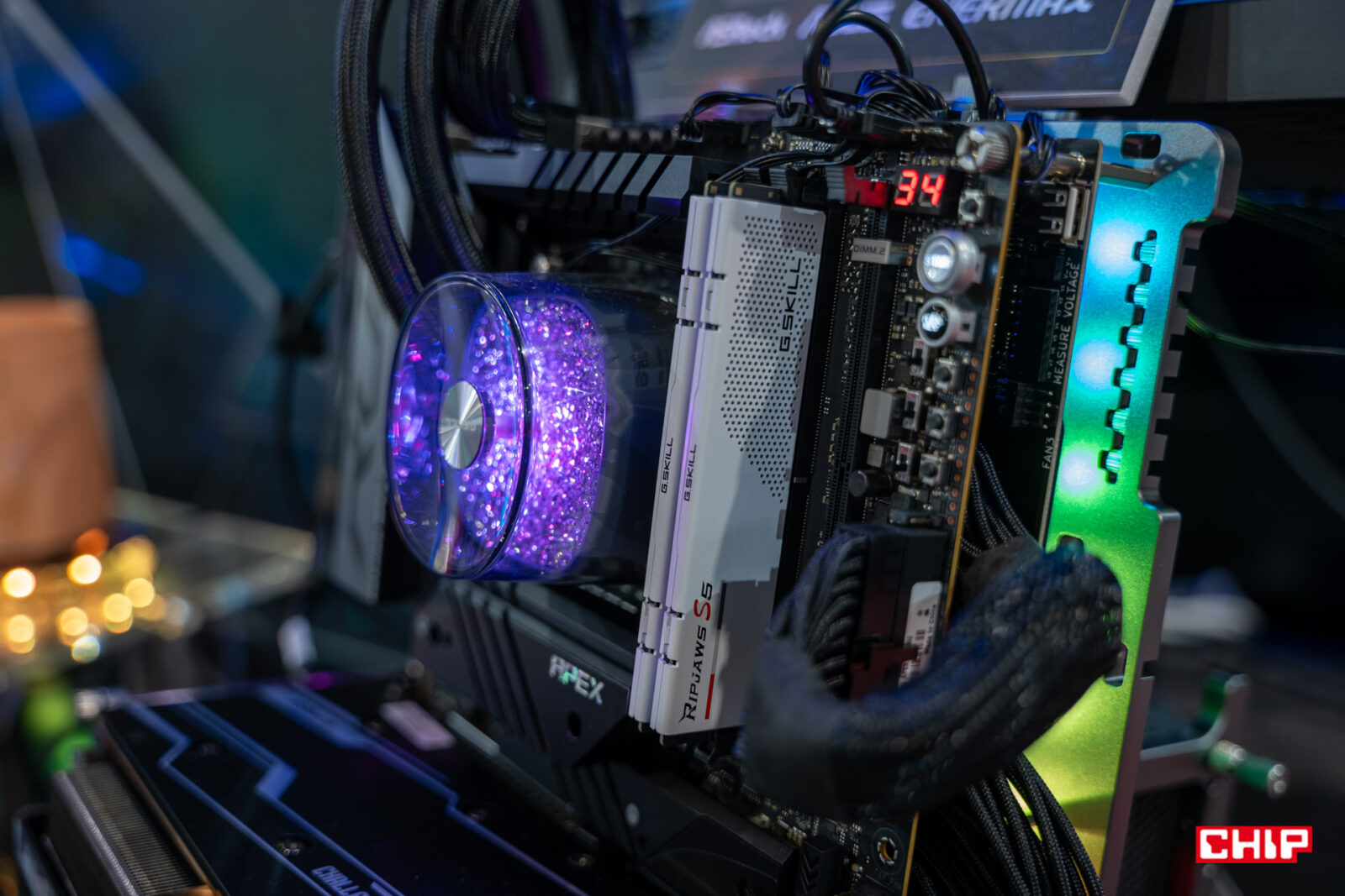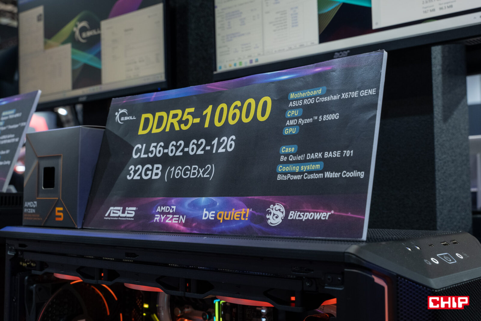 Pamięci DDR5 G.SKILL wykręcają duże prędkości i to nie stanowi zapewne dla nikogo zaskoczenia, podobnie jak to, że dobre wyniki potrafią osiągnąć zarówno poprzez Intel Extreme Memory Profile (XMP 3.0), jak i na AMD Expo. Dlatego też producent zaprezentował komputery z dwoma rozwiązaniami. Na ten moment najwyższy rezultat – wspomniane przeze mnie taktowanie 10600 MHz, zostało osiągnięte na jednostce z rozwiązaniami od AMD. Dla Intela zostało “skromne” 8600 MHz. Pamięci z taką przepustowością to inwestycja na przyszłość.