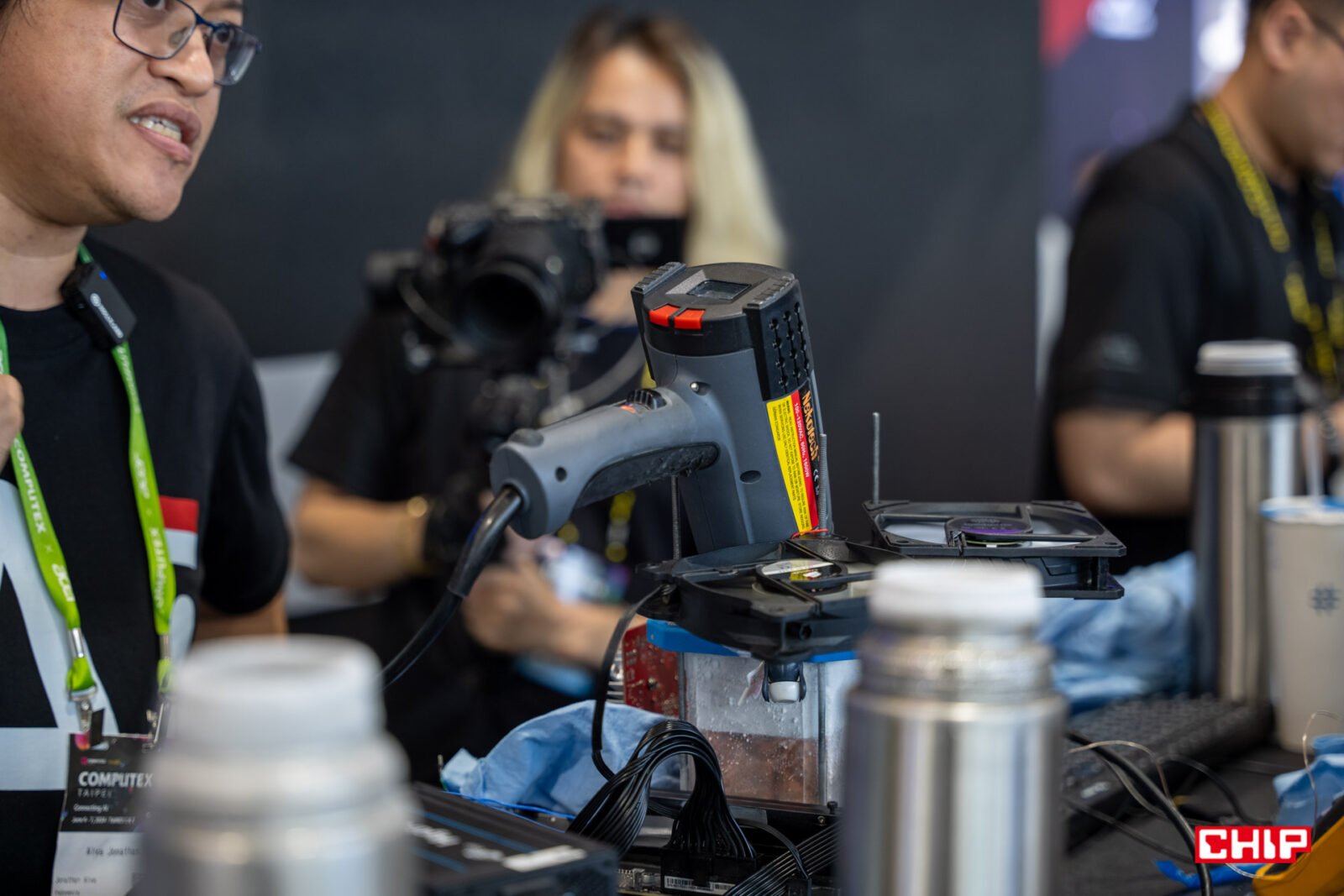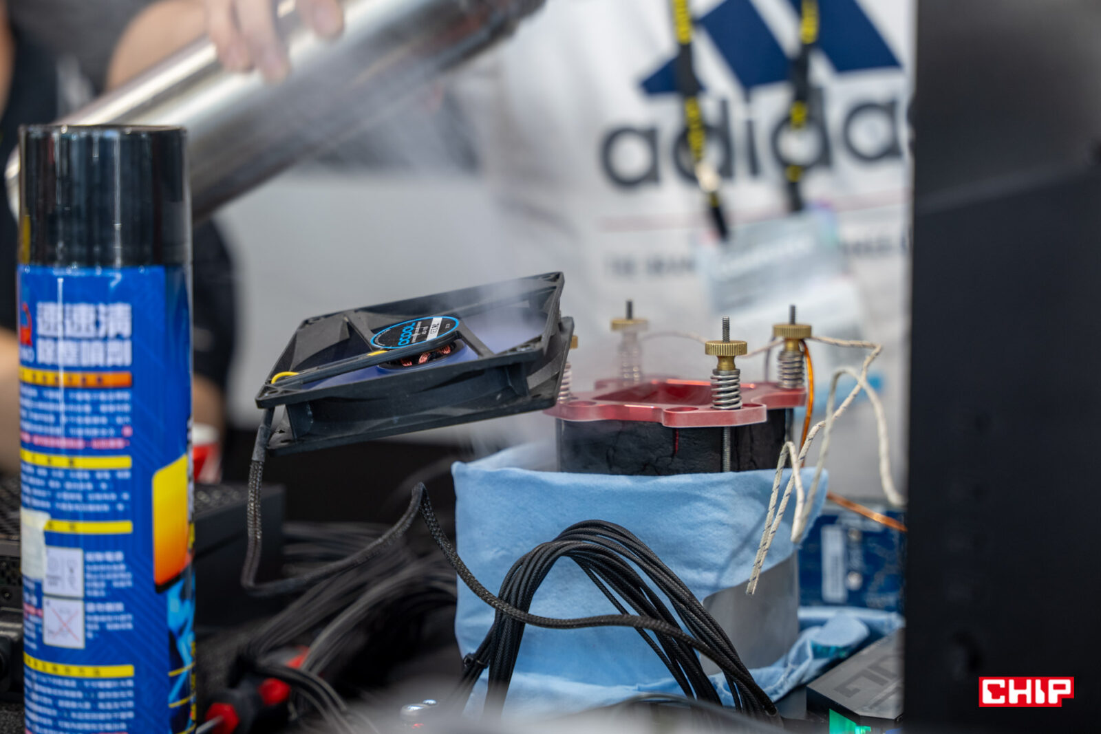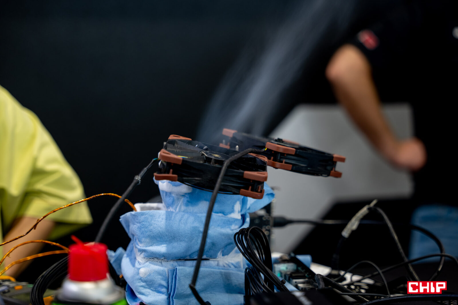 Na miejscu odbyła się tęż rywalizacja w podkręcaniu procesorów, co z miejsca nadało inny klimat stoisku, które owiał ciekły azot. Z podkręcaniem procesora miałem do czynienia raz i faktycznie wymaga to budowy sprawnego komina oraz inteligentnego zarządzania temperaturą tak, by jednocześnie nie doprowadzić do zatrzymania pracy sprzętu, ale schłodzić go na tyle, by powstrzymać tranzystory przed nadmiernym nagrzaniem. Do podkręcania wykorzystywano jednostki Intela, w tym i7-14700KF z maksymalnym taktowaniem rdzenia w trybie Boost na poziomie 5,6 GHz. Z tego wyniku Shimizu z Japonii doszedł do 8482,35 MHz.