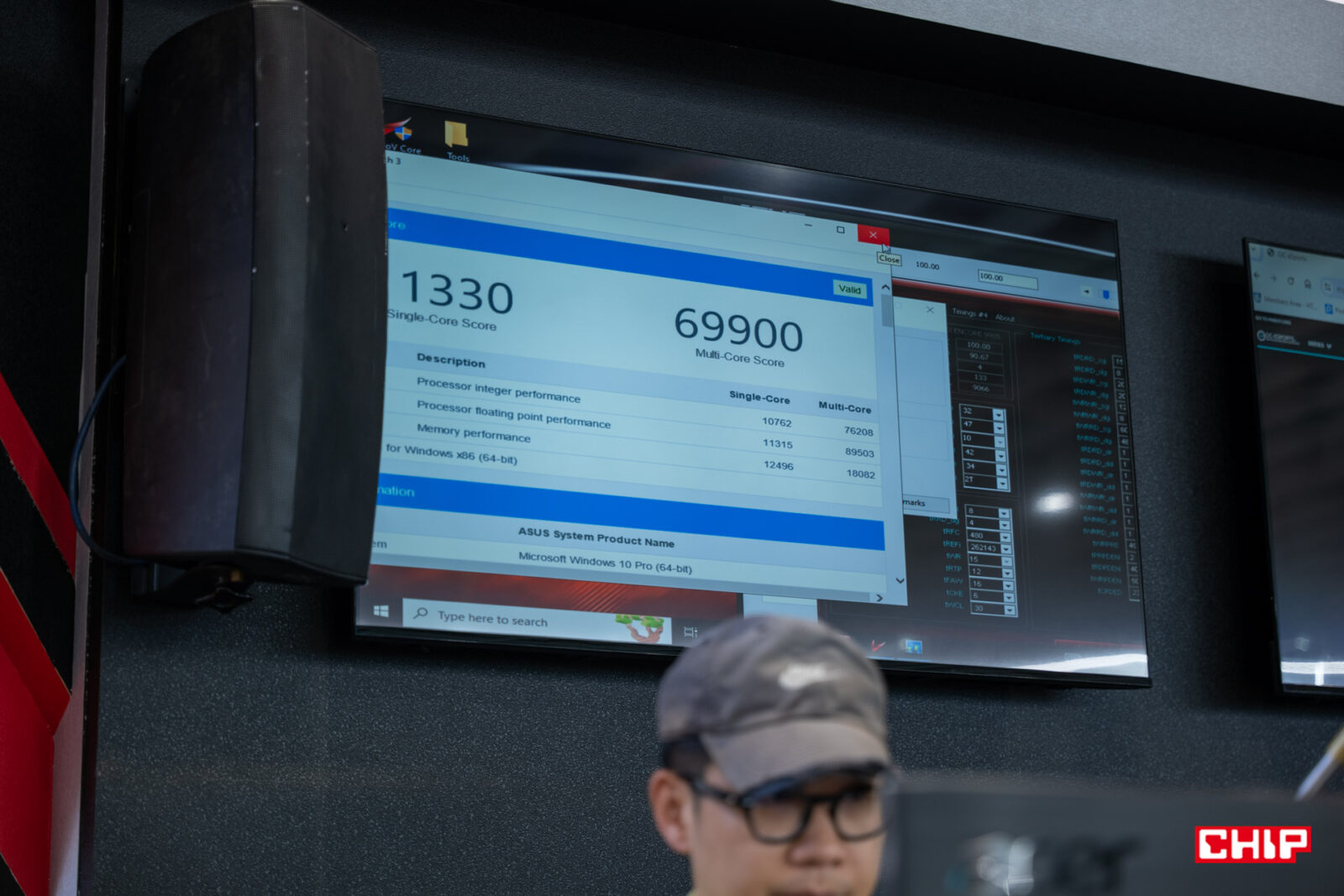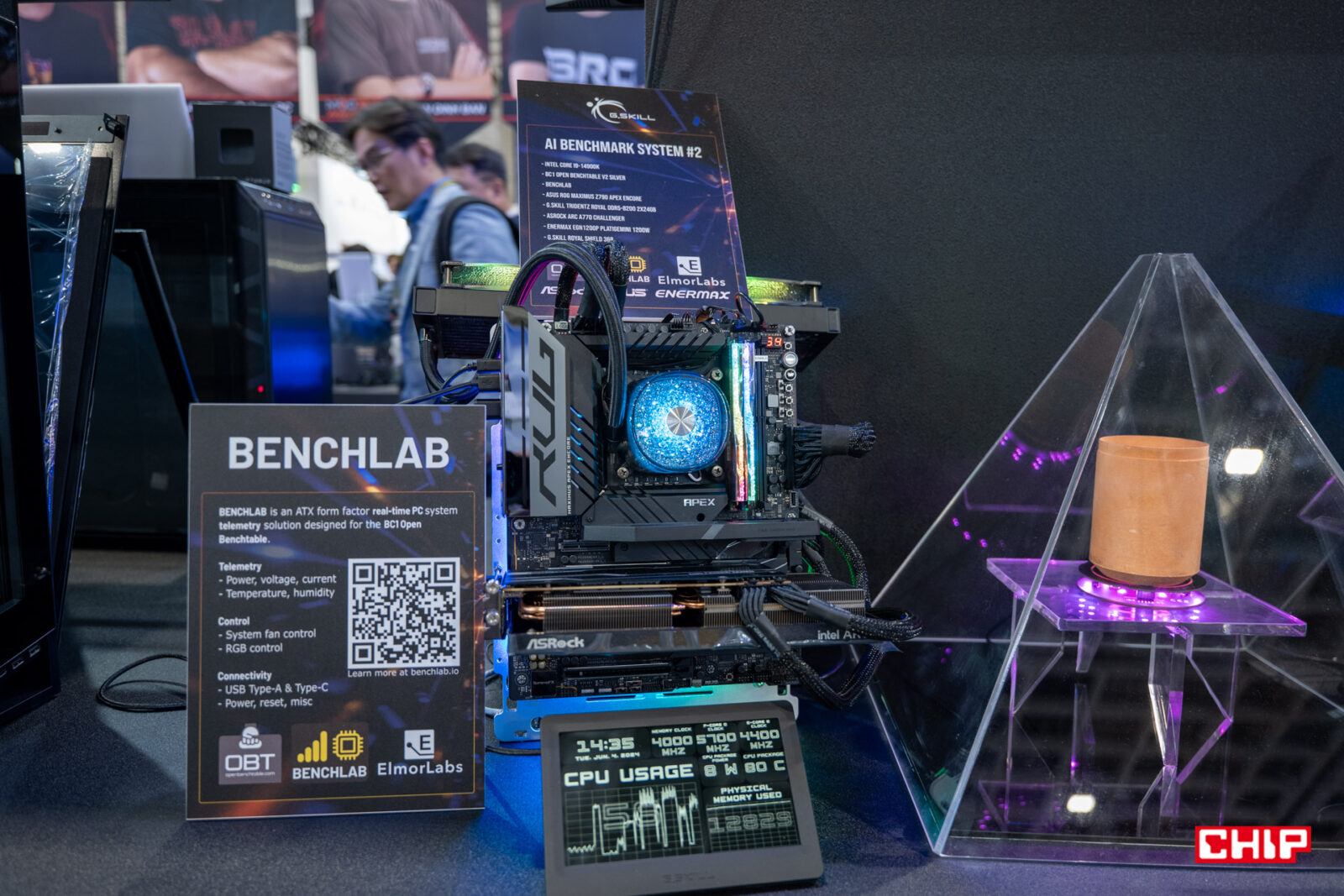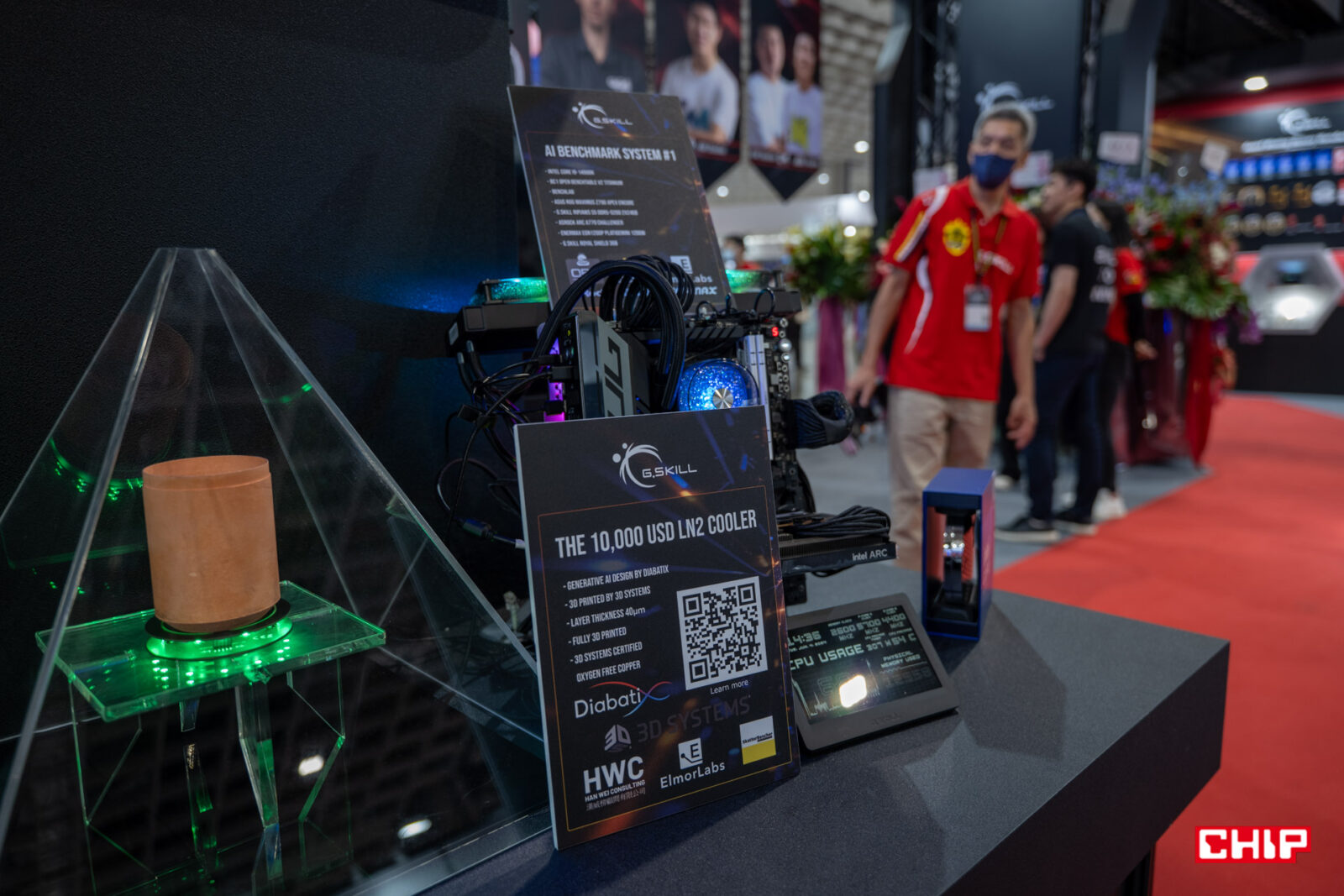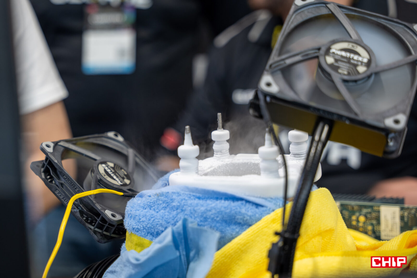 Na miejscu odbyła się tęż rywalizacja w podkręcaniu procesorów, co z miejsca nadało inny klimat stoisku, które owiał ciekły azot. Z podkręcaniem procesora miałem do czynienia raz i faktycznie wymaga to budowy sprawnego komina oraz inteligentnego zarządzania temperaturą tak, by jednocześnie nie doprowadzić do zatrzymania pracy sprzętu, ale schłodzić go na tyle, by powstrzymać tranzystory przed nadmiernym nagrzaniem. Do podkręcania wykorzystywano jednostki Intela, w tym i7-14700KF z maksymalnym taktowaniem rdzenia w trybie Boost na poziomie 5,6 GHz. Z tego wyniku Shimizu z Japonii doszedł do 8482,35 MHz.