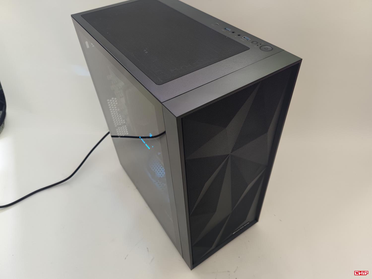 Na górze mamy filtr przeciwkurzowy mocowany na magnes. Pod nim jest miejsce na dwa wentylatory 120/140 mm. W modelu 605F jest jeden zamontowany – model ten sam co z przodu. Po prawej stronie jest też panel wejścia/wyjścia. Tutaj do dyspozycji mamy 1x USB-C 3.2 Gen2, 2x USB 3.0, 2x audio. Jest też przycisk startu i restartu, ale nie ma do sterowania LED – podświetleniem można więc sterować tylko przez oprogramowanie płyty głównej. Konfiguracja złączy jest pełna i zdecydowany plus za USB-C, które w cenie obudów nie jest zbyt często widziane.