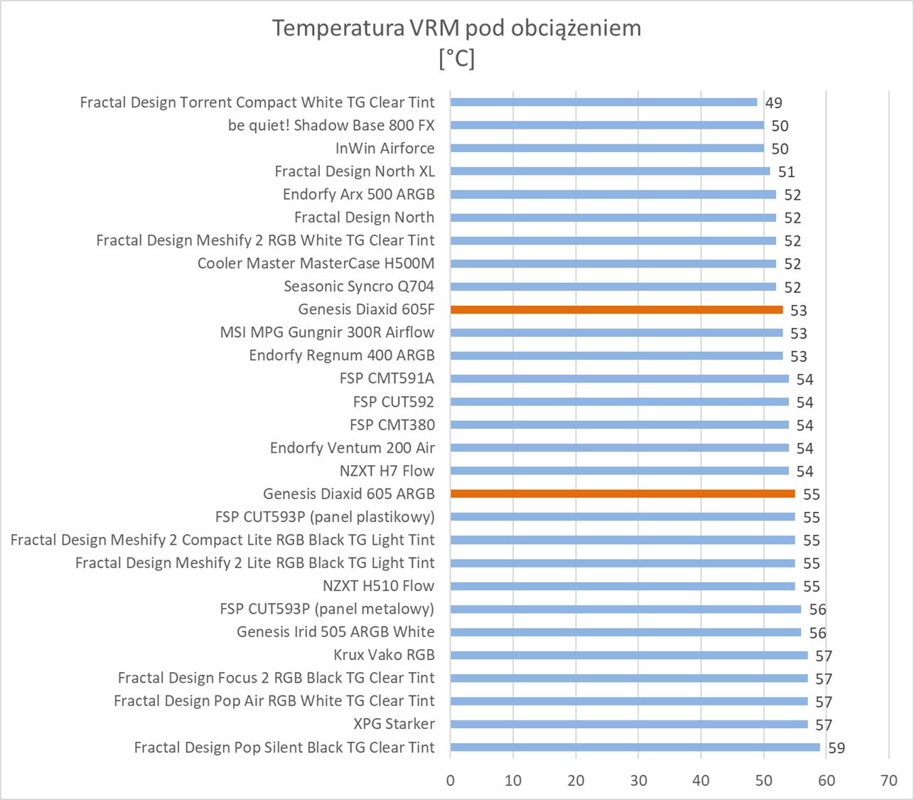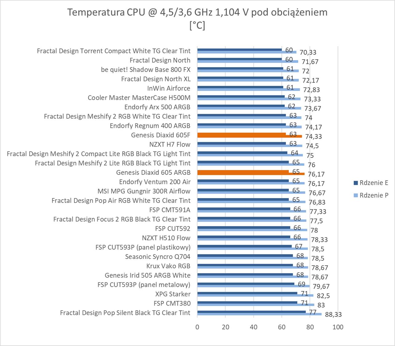 605F jest trochę głośniejszy od 605 ARGB, ale nie są to bardzo duże różnice. Obie obudowy nie będą należały do najcichszych, ale też nie są głośne. Są to też wyniki niewiele wyższe od sporej ilości innych obudów, a takie wartości pod obciążeniem nie powinny raczej Wam przeszkadzać.