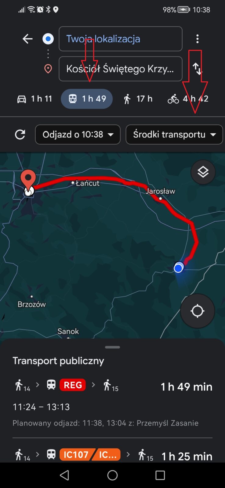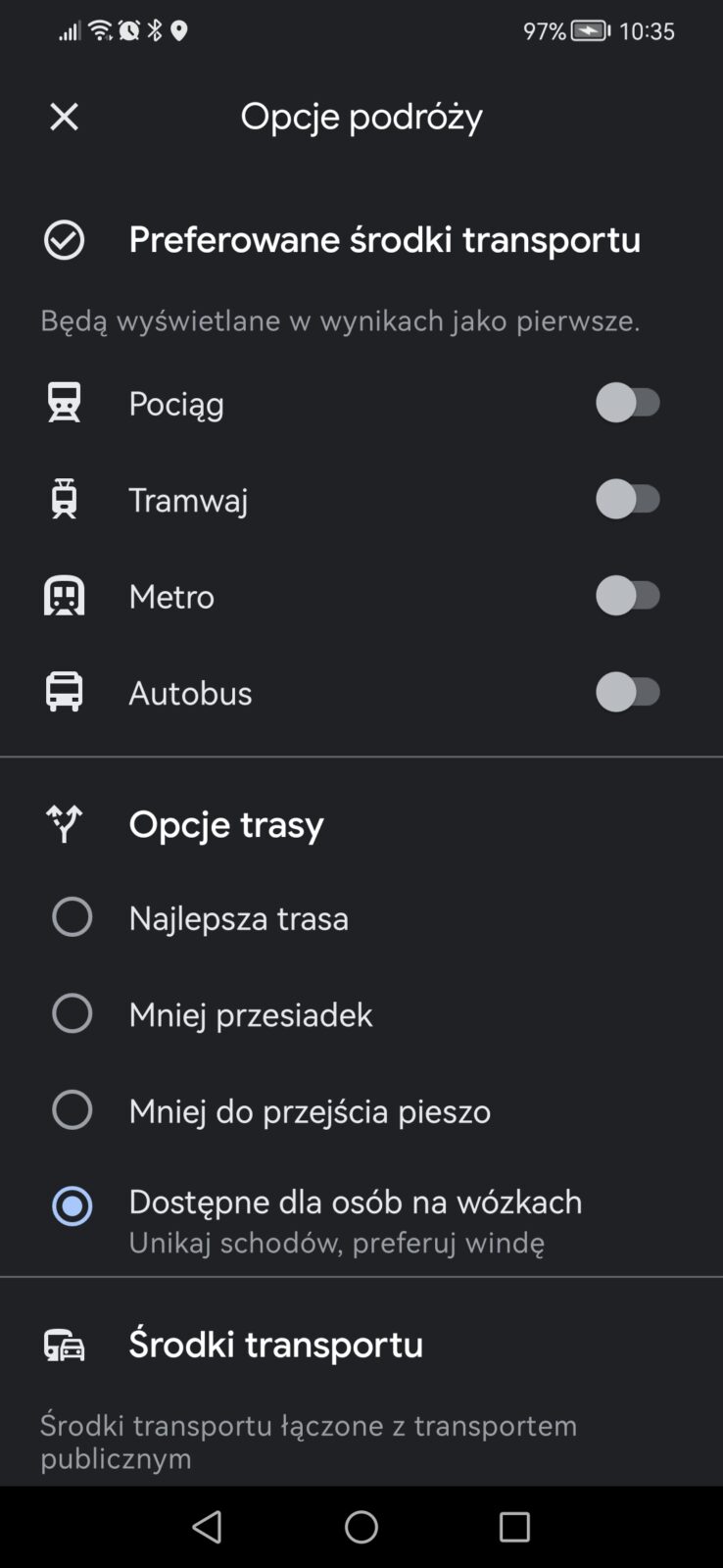 Pomoc dla niepełnosprawnych w transporcie publicznym? Żaden problem. Zaplanuj trasę i wybierz ją jako środek transportu. Wejdź w rozwijane menu “Środki transportu” i wybierz opcję “Dostępne dla osób na wózkach”.