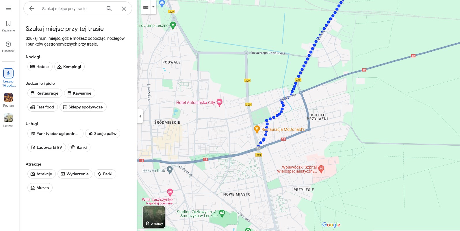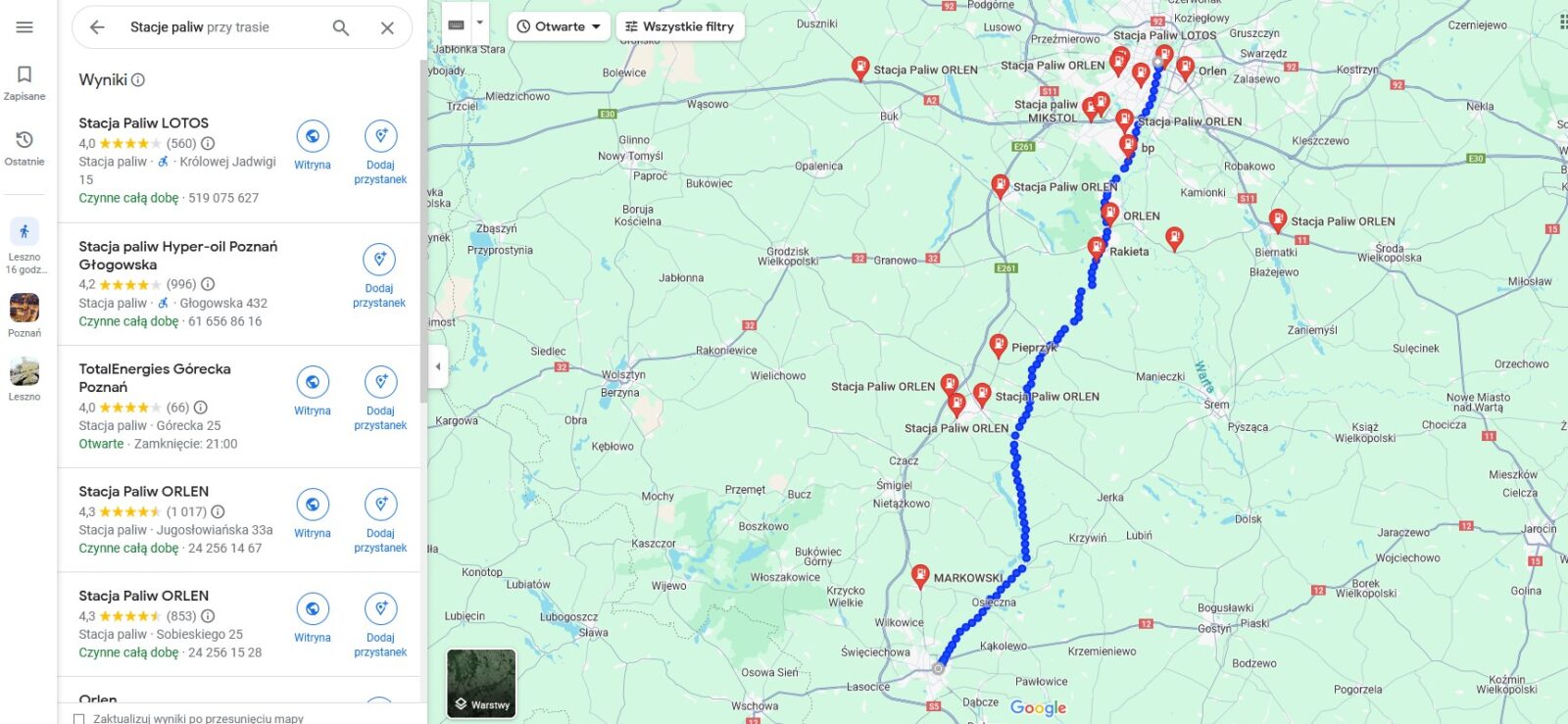 Miejsca przy trasie. Jeśli masz już ustaloną trasę, nie musisz ograniczać się do samych wskazówek na drodze, ale również zażyczyć sobie pokazania takich lokalizacji, jak punkty obsługi podróżnych, fast foody, stacje paliw, stacje ładowania i inne. W tym celu kliknij w pasek wyszukiwania “Szukaj miejsce przy trasie”, a następnie wybierz to, co Cię interesuje. I gotowe.