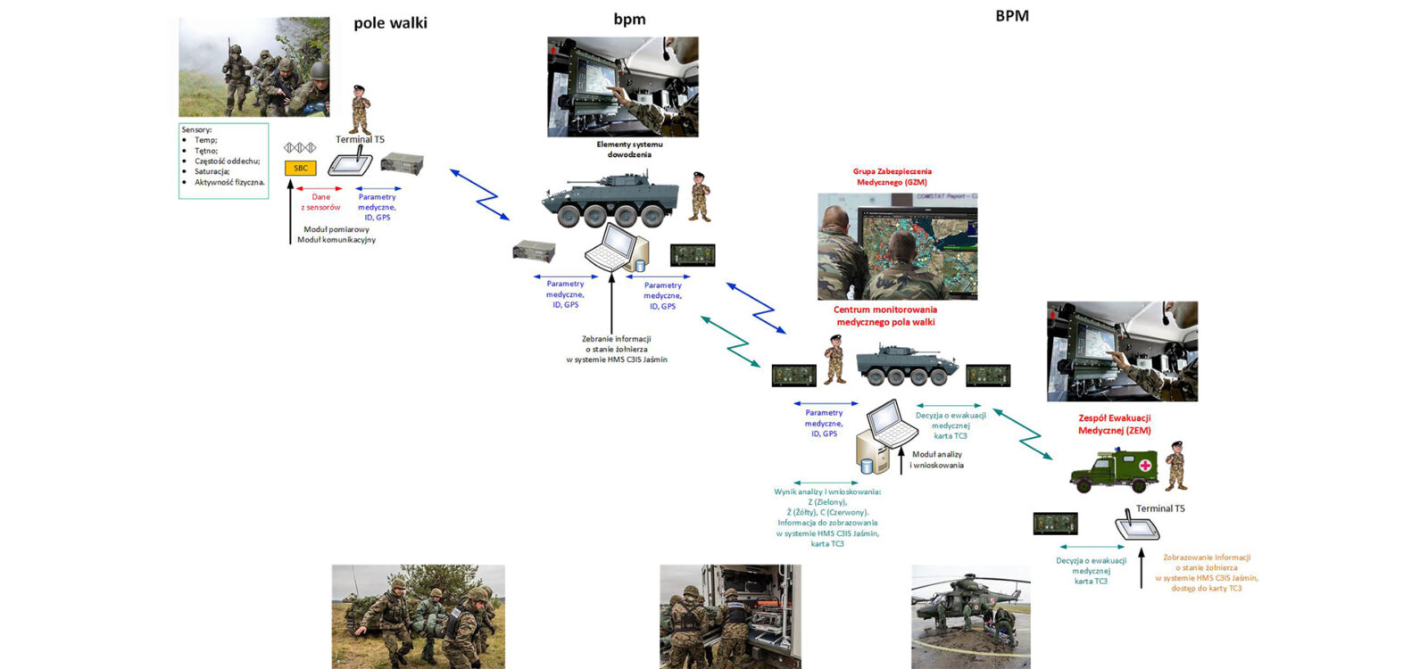 Biosensory będą skoordynowane z systemem zarządzania walką szczebla taktycznego HMS C3IS JAŚMIN – dowiadujemy się z informacji Wydziału Elektroniki WAT. Parametry życiowe pomierzone przez specjalne czujniki na odzieży pozwolą na automatyczne zakwalifikowanie żołnierza lub każdego innego funkcjonariusza służb mundurowych do grupy określonej kolorami: zielonym, żółtym lub czerwonym.