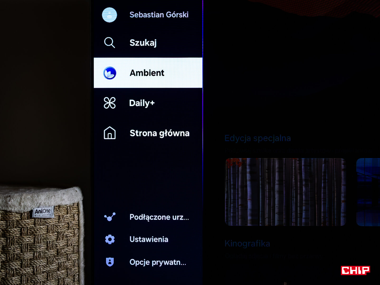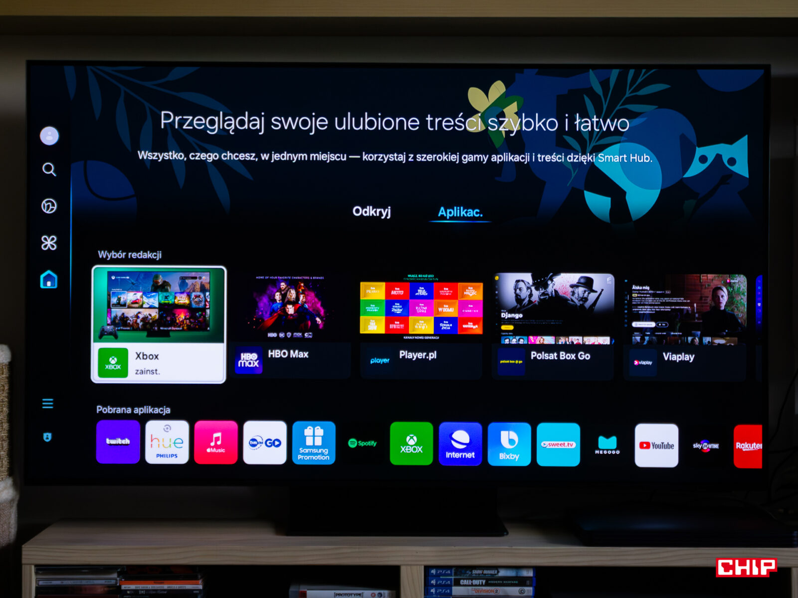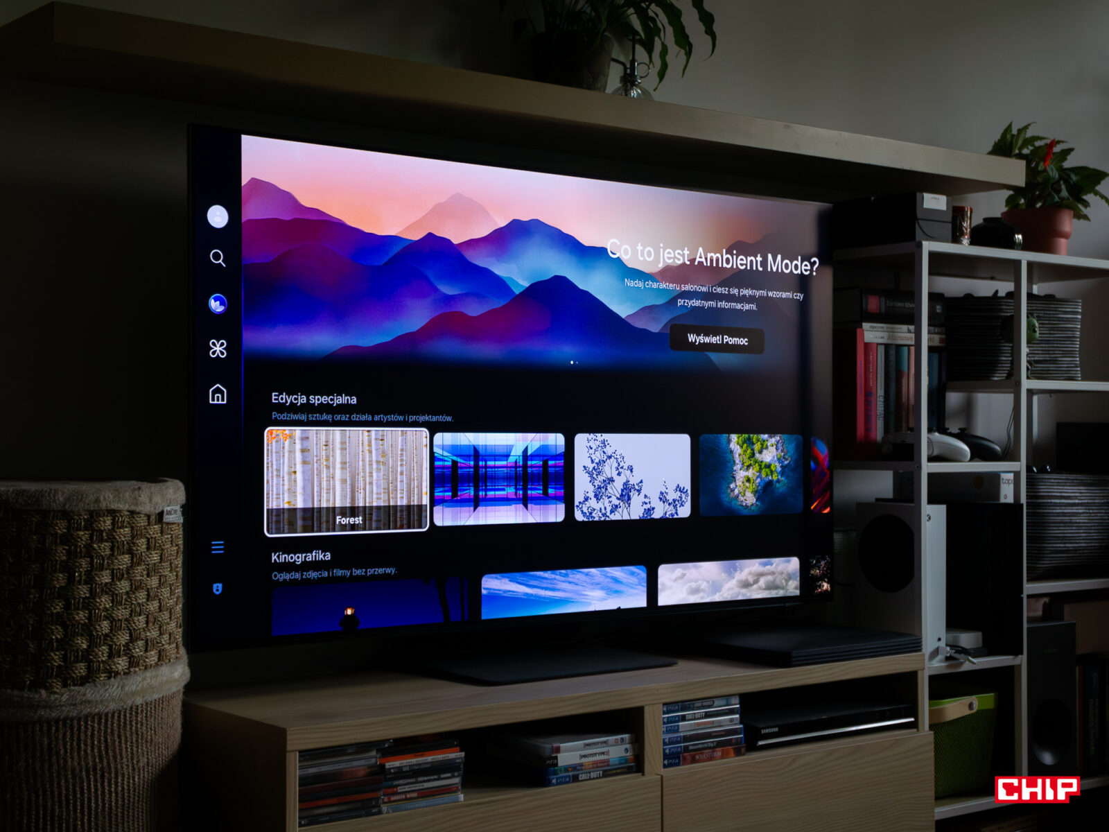 To może teraz nieco o tzw. funkcjach Smart, które agreguje autorska platforma systemowa Tizen, charakterystyczna dla telewizorów koreańskiej marki już od lat. Nie jest to mój pierwszy kontakt z tym systemem w produktach RTV od Samsunga, więc czułem się tutaj pewnie, ale nawet mniej doświadczona osoba dość szybko ogarnie podstawy obsługi, szczególnie, że producent jest dość zachowawczy w kwestii gruntownej przebudowy interfejsu. Mamy tu przyzwoity asortyment najpopularniejszych aplikacji do konsumowania treści – m.in. Netflix, Disney+, Apple TV+, Amazon Prime Video, Max (dawniej HBO Max), system rekomendacji treści, podział na kategorie tematyczne aplikacji i wbudowanych narzędzi. Oczywiście nie zabrakło zakładki Ambient, czyli efektownych animowanych tapet, które mogą ozdabiać ekran kiedy z niego akurat nie korzystamy.