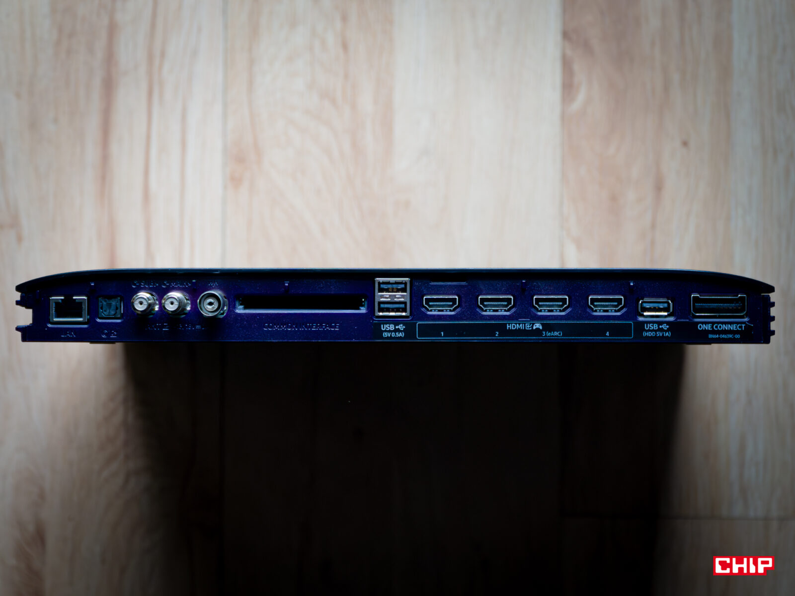 Takie rozwiązanie bardzo mi się spodobało, bo zdecydowanie ułatwia dostęp do kluczowych złącz, tradycyjnie upchniętych z tyłu i trudnych w dostępie, szczególnie jeśli chcielibyśmy telewizor powiesić na ścianie. Tutaj między One Connect Pro i telewizorem mamy tylko jeden niewielki kabel światłowodowy, który jest na tyle dyskretny, że nie będzie psuć nawet bardziej eleganckich salonów. Spięcie ze sobą całości i ustawienie na docelowym miejscu nie zajęło dużo czasu. Solidna metalowa podstawka, na której spoczywa telewizor nie daje co prawda możliwości obracania ekranu, ale stabilnie utrzymuje konstrukcję w bezruchu. Podręcznik użytkownika w wizualny sposób prowadzi krok po kroku przez cały proces montażu. We wstępnej konfiguracji pomaga z kolei aplikacja mobilna Samsung SmartThings. Zdecydowanie łatwiej jest w ten sposób połączyć telewizor z domową siecią Wi-Fi zamiast używać pilota do wprowadzania hasła.