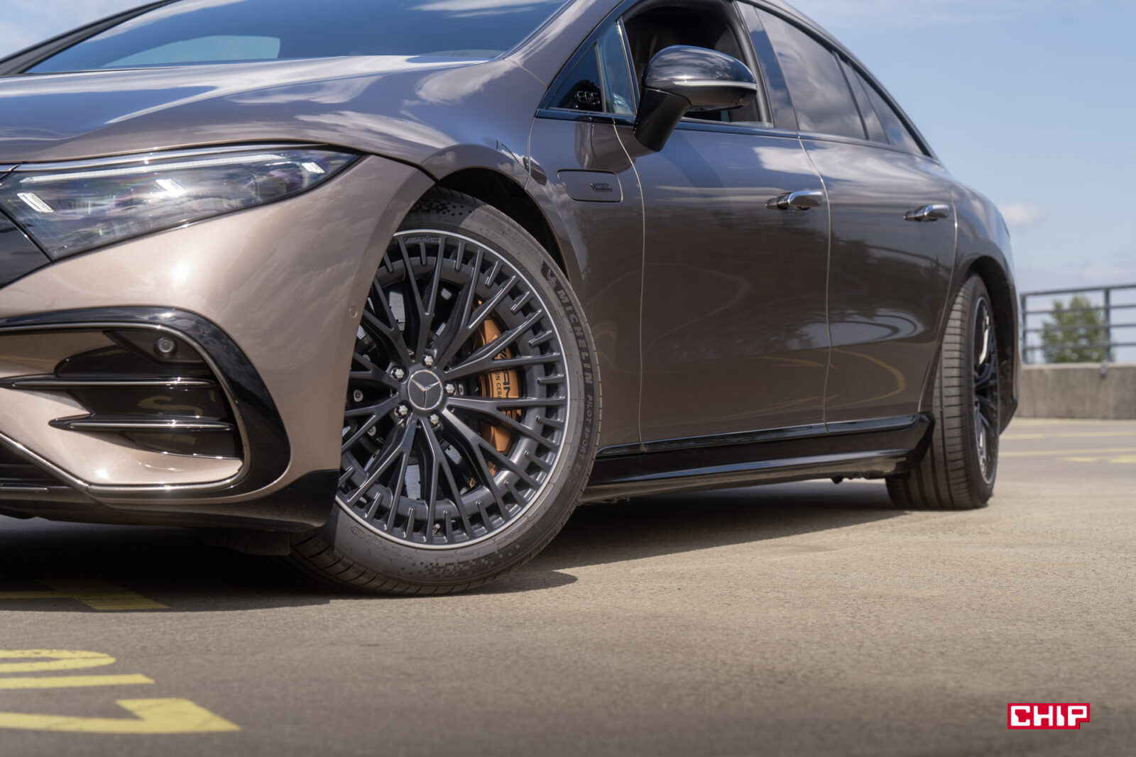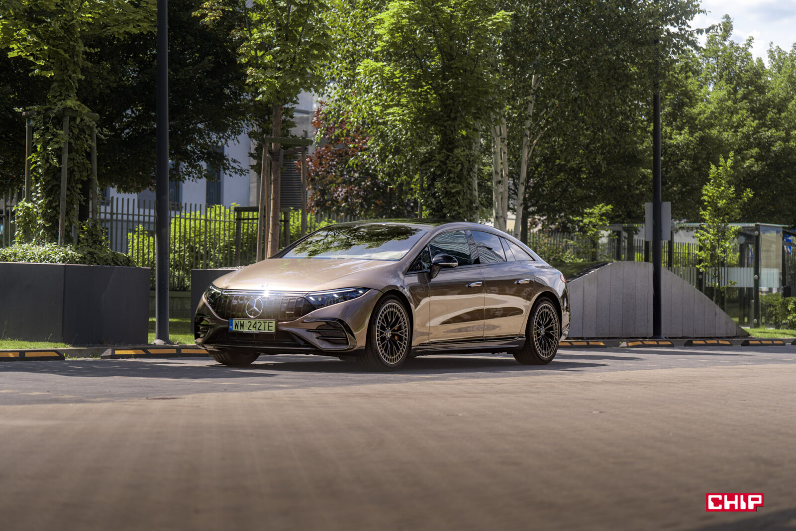 Kiedy jednak ustawimy się pod odpowiednim kątem, Mercedes-AMG 53 EQS zaczyna zachwycać. Jest bardzo szeroki, z potężnymi nadkolami. Z przodu ma ekstremalnie niziutką maskę i szerokie… coś, co w aucie spalinowym byłoby grillem. To wszystko razem tworzy bardzo futurystycznie wyglądające auto.