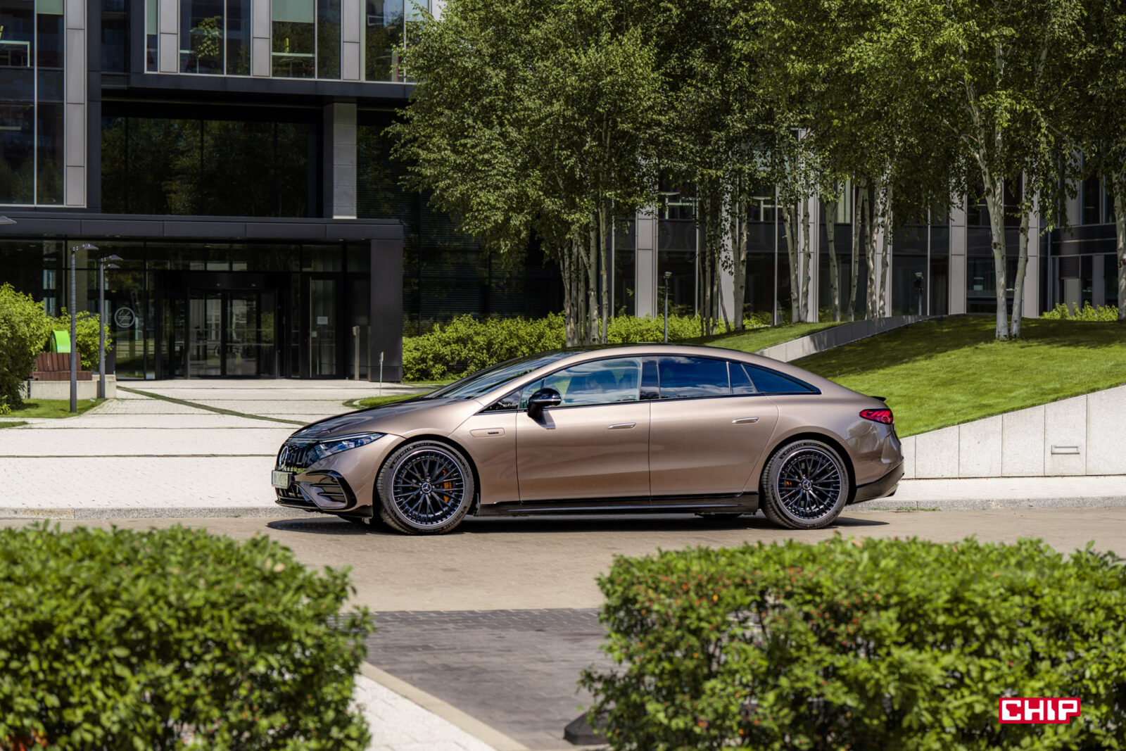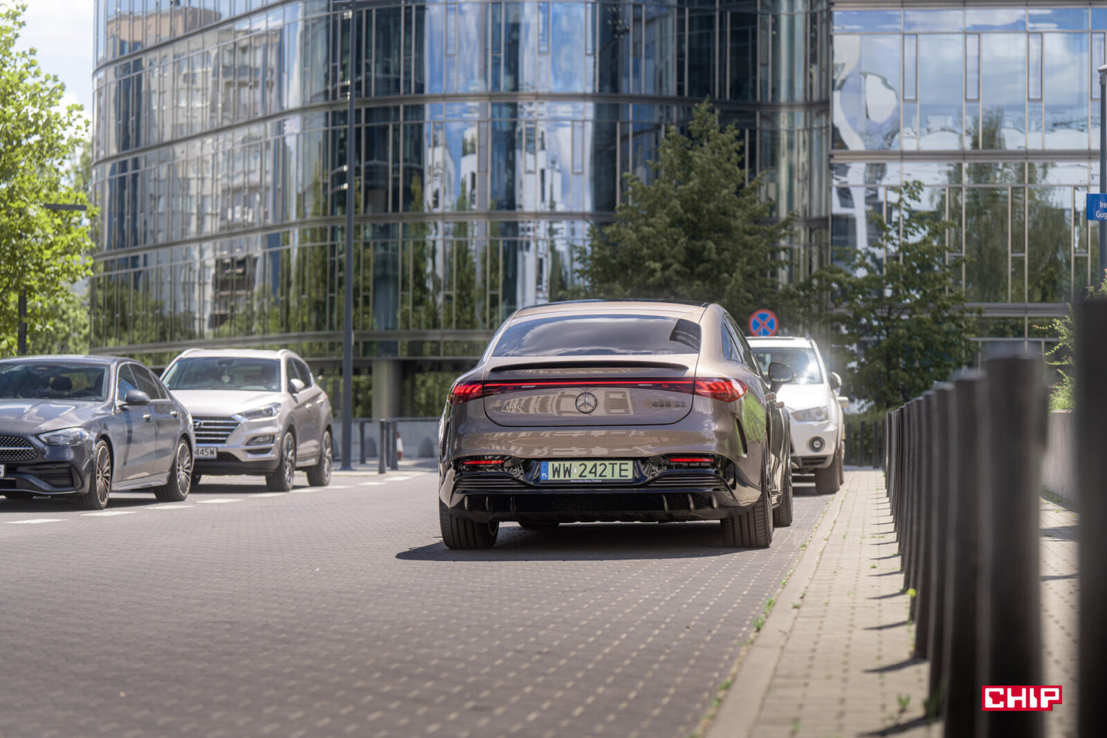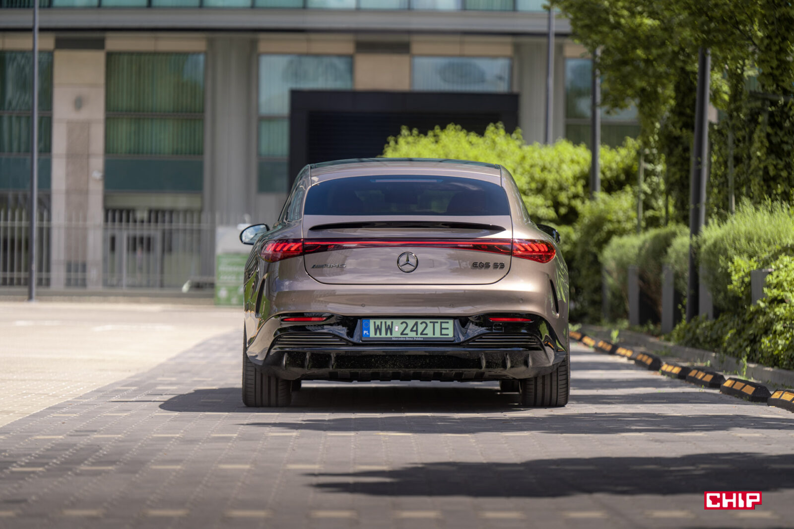 Szczególnie w wariancie testowym, bo nie pierwszy raz auto z parku prasowego Mercedesa jest nietypowo skonfigurowane. Piaskowy lakier nijak kojarzy się z bardzo szybkim AMG. Podobnie jak niedorzecznie wielkie, zabudowane felgi, które widziałbym w leniwie toczącym się Maybachu, a nie aucie sportowym. Wszystko to potęguje efekt wow!, jaki robi EQS 53.