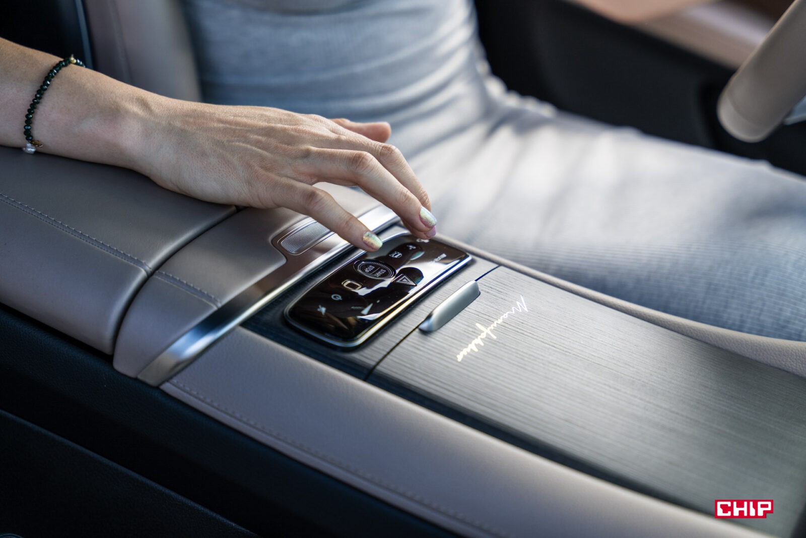 Drewno na tunelu środkowym oraz hyperscreen dają lepszy odbiór auta pod kątem wykonania. Tafla szkła usztywnia deskę rozdzielczą, która w podstawowej wersji lubi brzydki skrzypieć, tutaj wypada to nieco lepiej. A drewno z pakietu Manufactur z eleganckim napisem na środku… Czysta poezja.