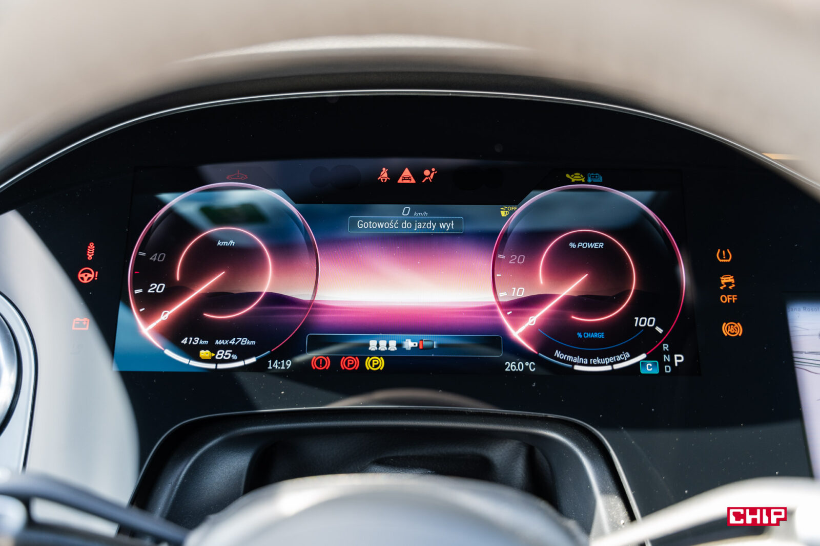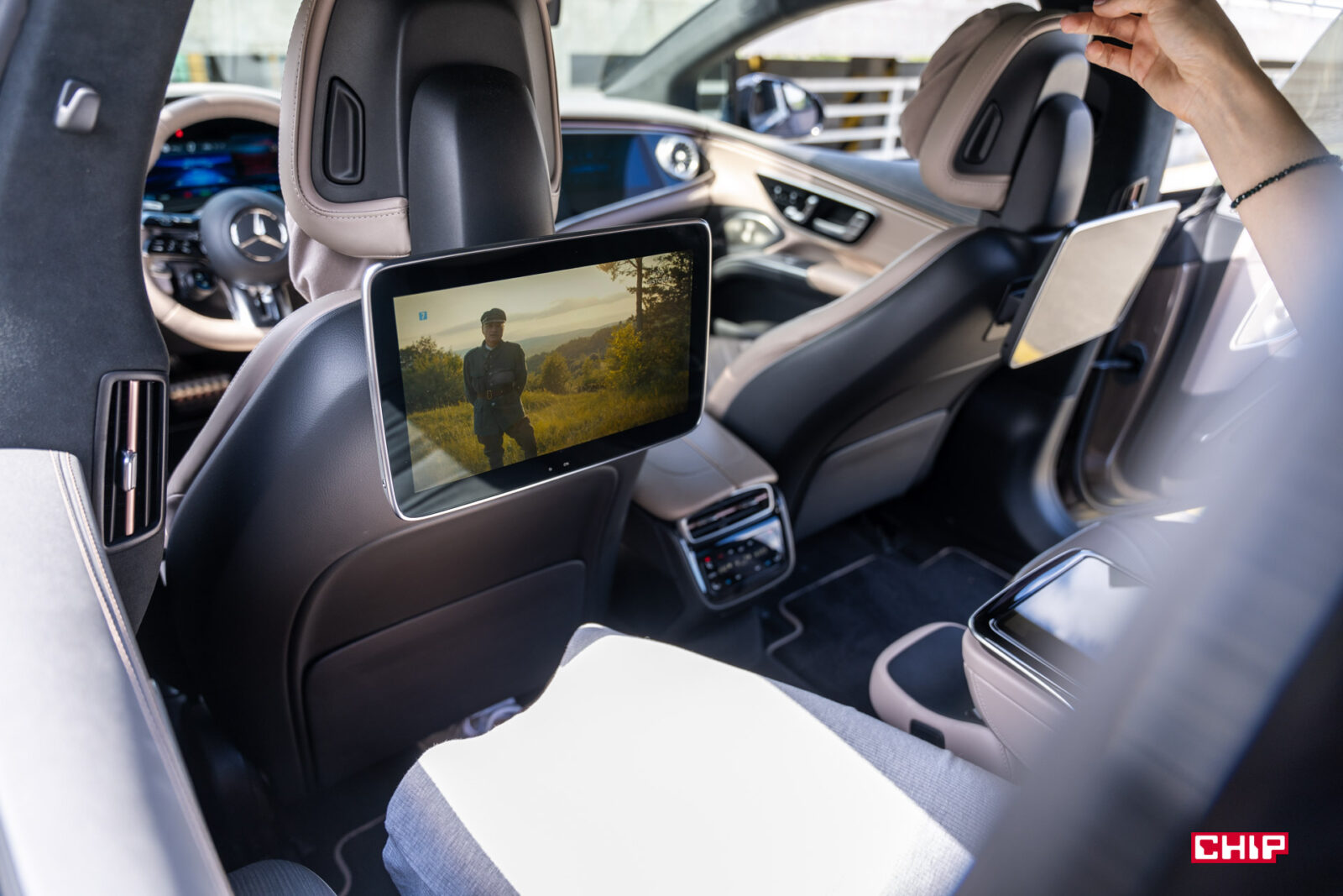 Lekkie uproszczenie miejscami też by się przydało, bo o ile cały interfejs jest prosty w obsłudze, tak przy próbie przeniesienia obrazu telewizji z tylnego ekranu na główny (to powinno być w każdym aucie elektrycznym, nie ma to jak seans Harry’ego Pottera na TVN7 w trakcie ładowania <3) na dłuższą chwilę się zakopałem w Menu. A po ruszeniu, co jest oczywiste, obraz zniknął z ekranu głównego, ale pozostał dźwięk w głośnikach. Mniej techniczny użytkownik może poczuć się tym wszystkim trochę przytłoczony. Sama telewizja działa nieco gorzej niż np. w BMW X5, w którym byłem w stanie w trakcie podróży obejrzeć bez przerw cały mecz piłki nożnej. Mercedes lubił czasem zgubić sygnał.