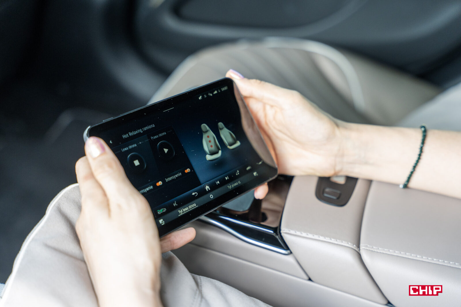 Sterowanie wszystkimi udogodnieniami odbywa się albo na ekranach przed pasażerami z tyłu, albo z poziomu tabletu w rozkładanym podłokietniku. Różne warianty oświetlenia, podświetlenia, regulacja dźwięku, masażu… Długo by wymieniać.