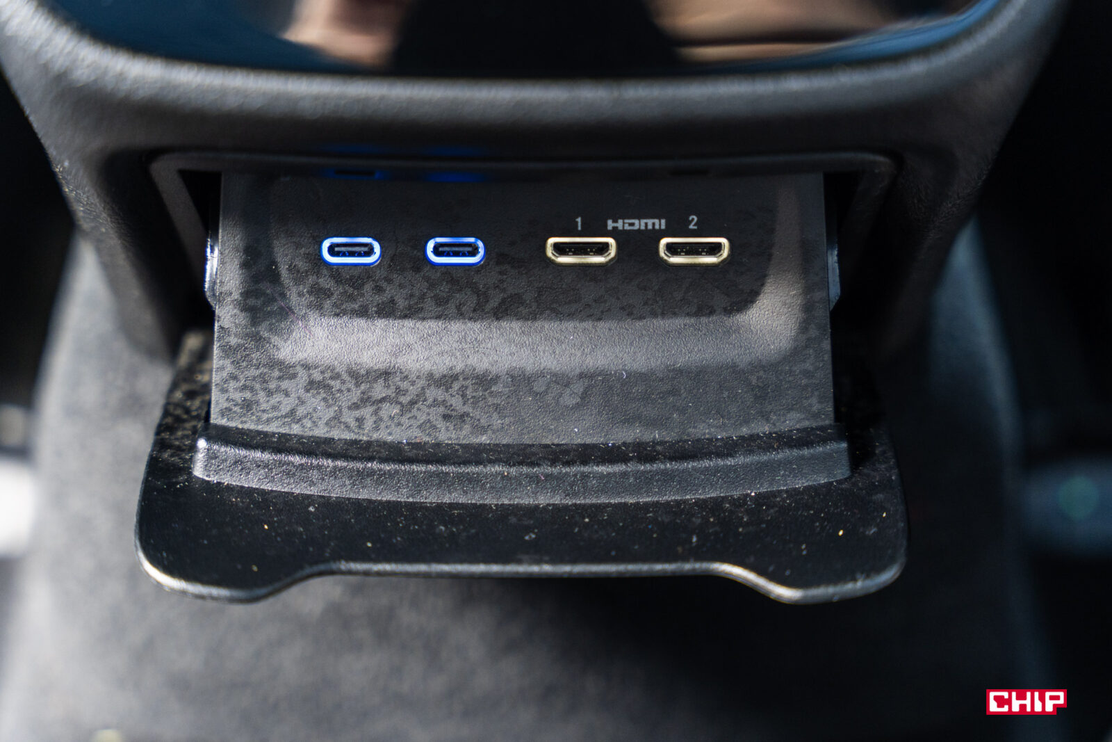 Na ekranach możemy też pracować, wystarczy podłączyć laptopa do portu HDMI umieszczonego w wysuwanym schowku pod panelem sterowania klimatyzacji. Bardzo dobra opcja, ale zdecydowanie brakuje tu klasycznego gniazda zasilania 230V, np. pod kanapą. Wtedy możliwe byłoby tu nawet podłączenie konsoli.