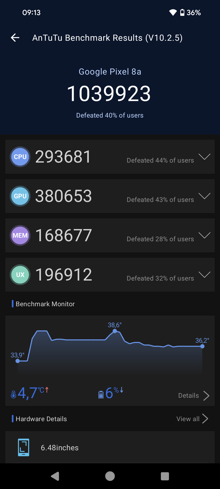 - Antutu Benchmark 10.2.5 – 1 039 923 pkt