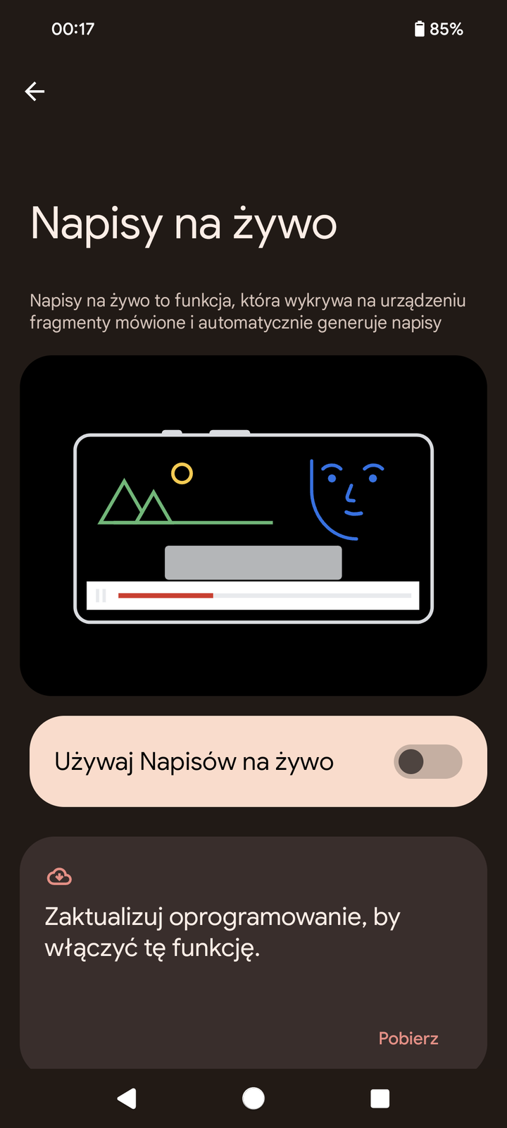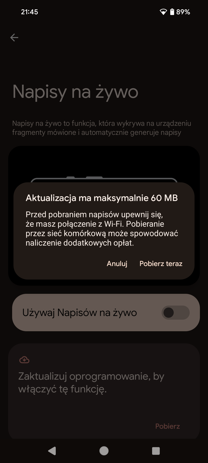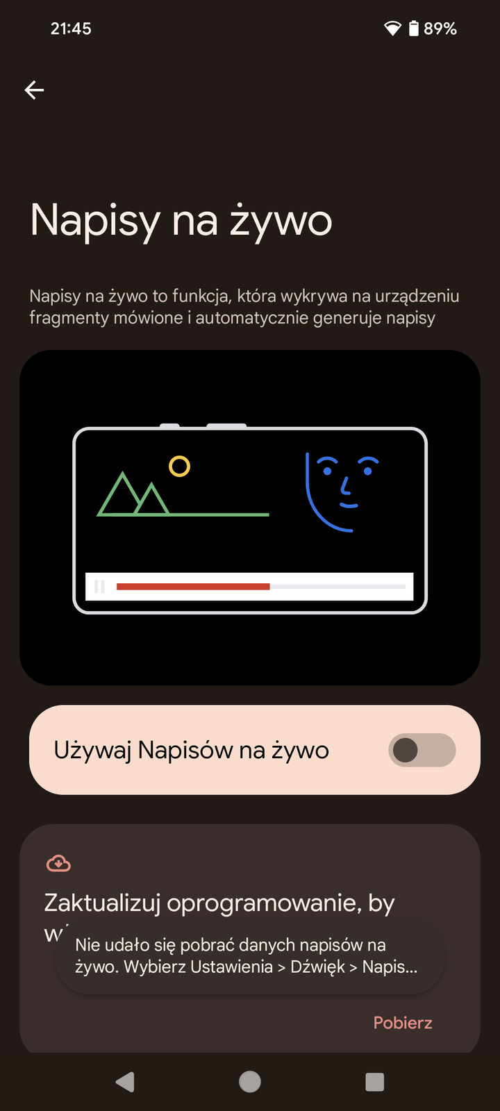 - Napisy na żywo – witają mnie komunikatem o konieczności aktualizacji, by potem wywalić błąd przy ściąganiu danych. I tak cały czas – żadne próby nic nie dały, także póki co funkcja bezużyteczna