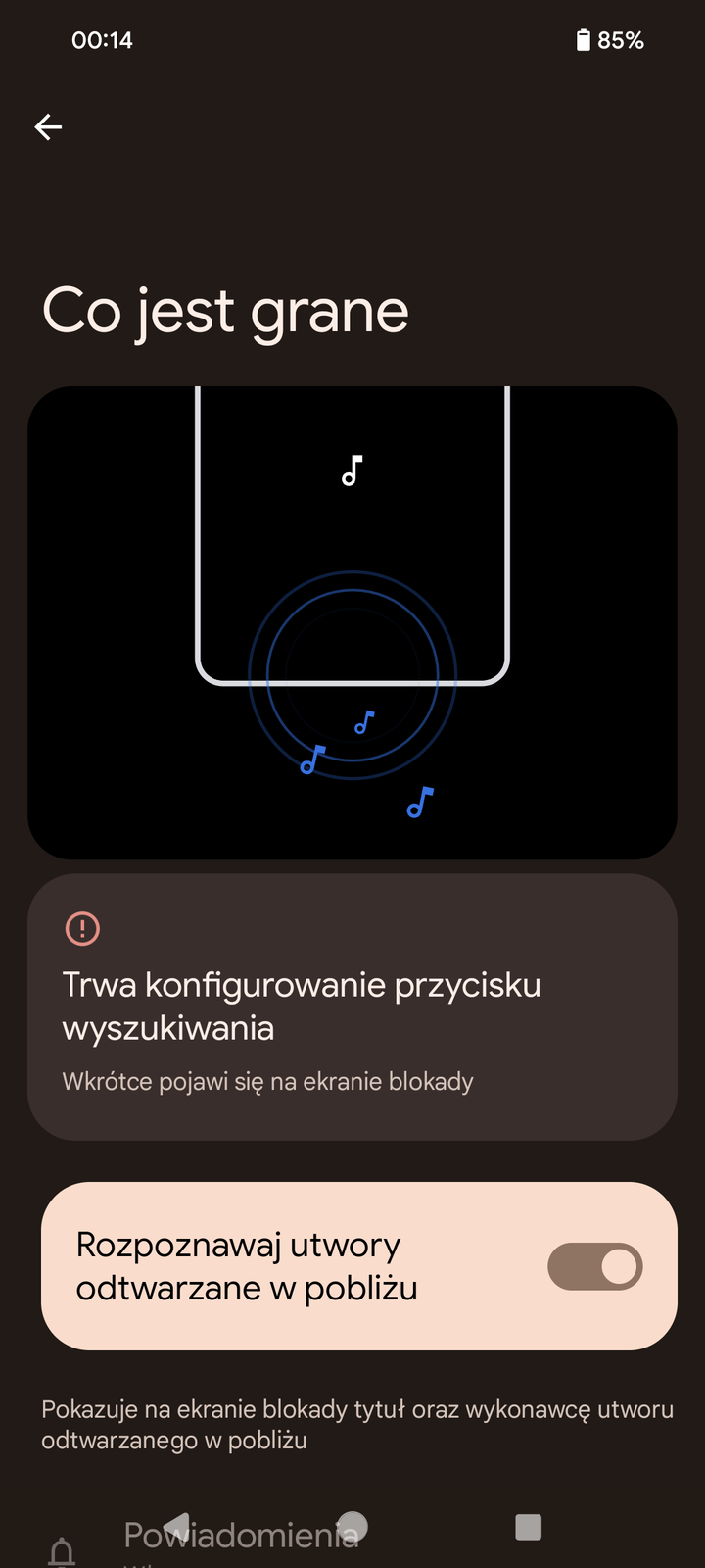 - Co jest grane – ma za zadanie wykrywać jaka muzyka jest grana w tle i na ekranie blokady pokazywać utwór i wykonawcę. Tak, ale na początku trzeba pobrać pakiet kilkuset MB danych z pamięcią utworów. Później funkcja działa… no ogólnie działa, ale polskich ani francuskich utworów nie rozpoznaje. Co więcej, w niektórych przypadkach jedne utwory artysty rozpoznają, a inne nie. Np. w przypadku Carlosa Santany utwór „The game of love” rozpoznaje bez problemu, natomiast wydany rok później „ I’m feeling you” już nie. Co więcej przycisk wyszukiwania, który ma miał się pojawiać na ekranie blokady… stale się konfiguruje. A przynajmniej ciągle taki komunikat wyświetla się w menu.