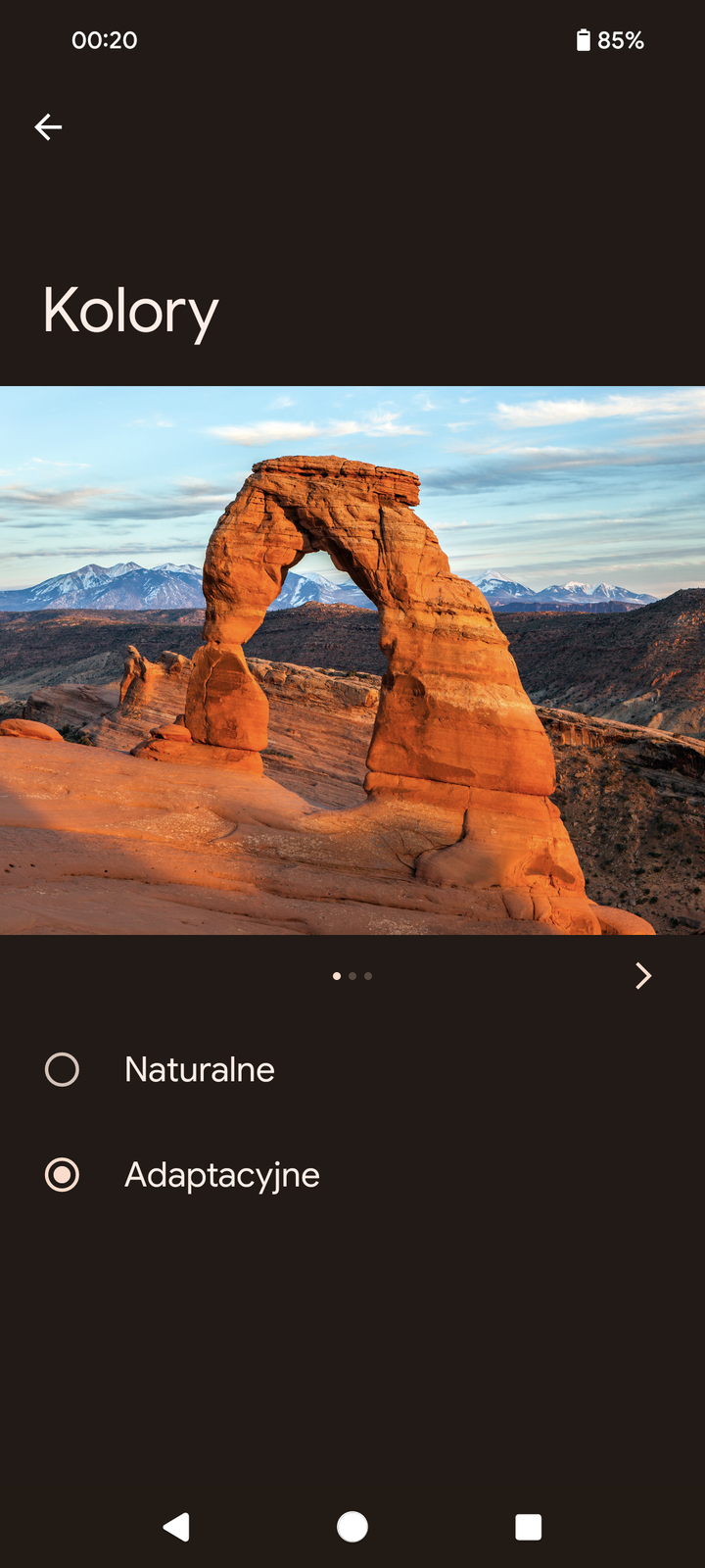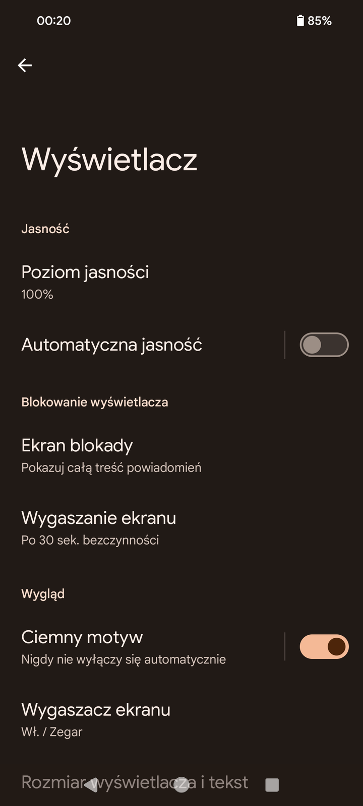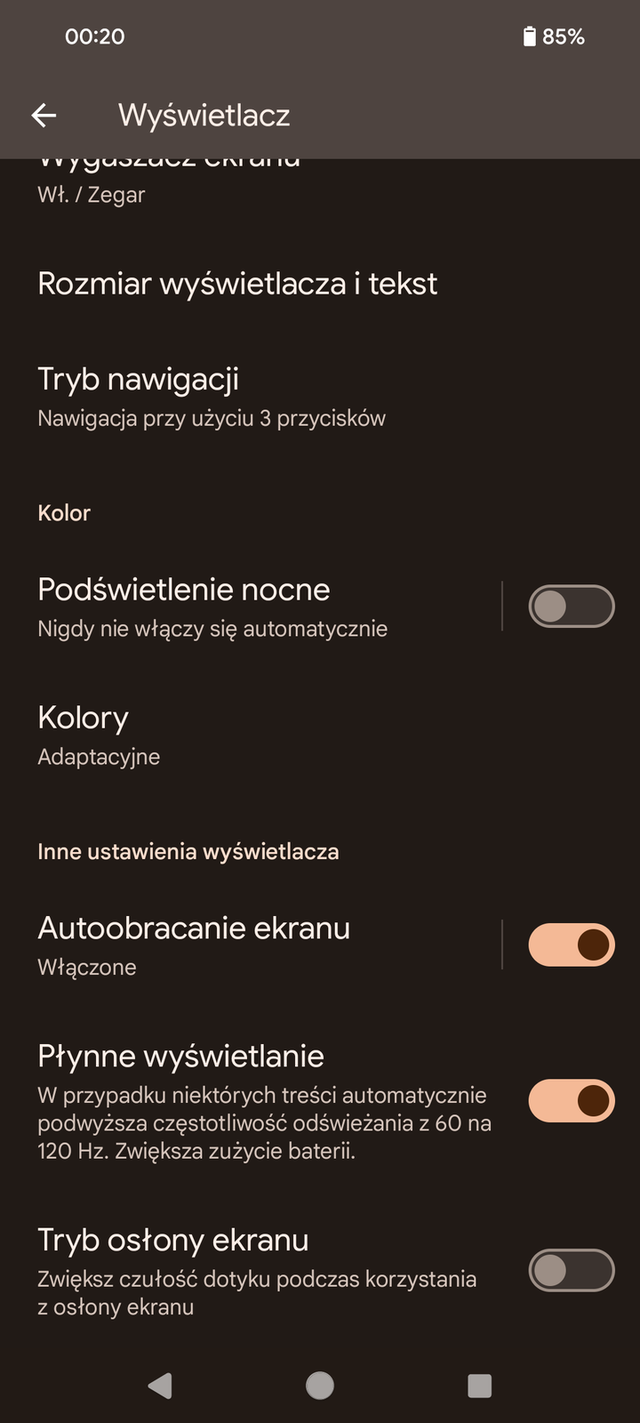 W ustawianiach znajdziemy oczywiście tryb ciemny dla menu (niestety nie jest on czarny, a szary), filtr światła niebieskiego oraz możliwość regulacji barw i częstotliwości odświeżania ekranu (w ograniczonym stopniu). Jest również Always On Display.