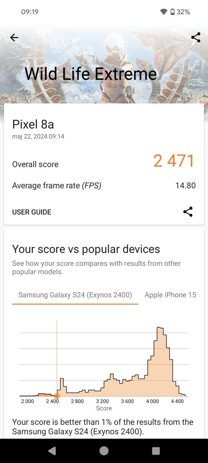 Jak przystało na ekran OLED, mamy tu do czynienia z perfekcyjną czernią i kątami widzenia, oraz z nasyconymi barwami. Super. Częstotliwość odświeżania ekranu domyślniej jest ustawiona na 60 Hz (żeby oszczędzać baterię), ale możemy ją zmienić na znacznie płynniejsze 120 Hz w menu urządzenia. Jeśli chodzi o maksymalną jasność, to zapowiadane przez producenta 2000 nitów szczytowej jasności możemy raczej włożyć między bajki. W ostrym majowym słońcu ekran był czytelny, ale jednak odruchowo szukało się cienia… Na pewno pod tym kątem ekran z Google Pixela 8a nie ma podjazdu do tego z Samsunga Galaxy S24.