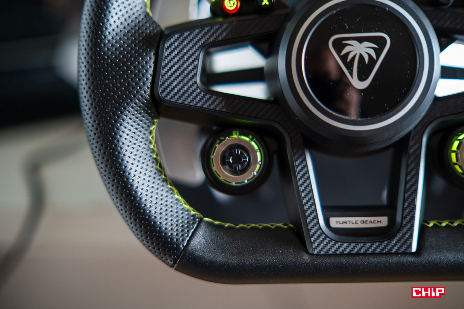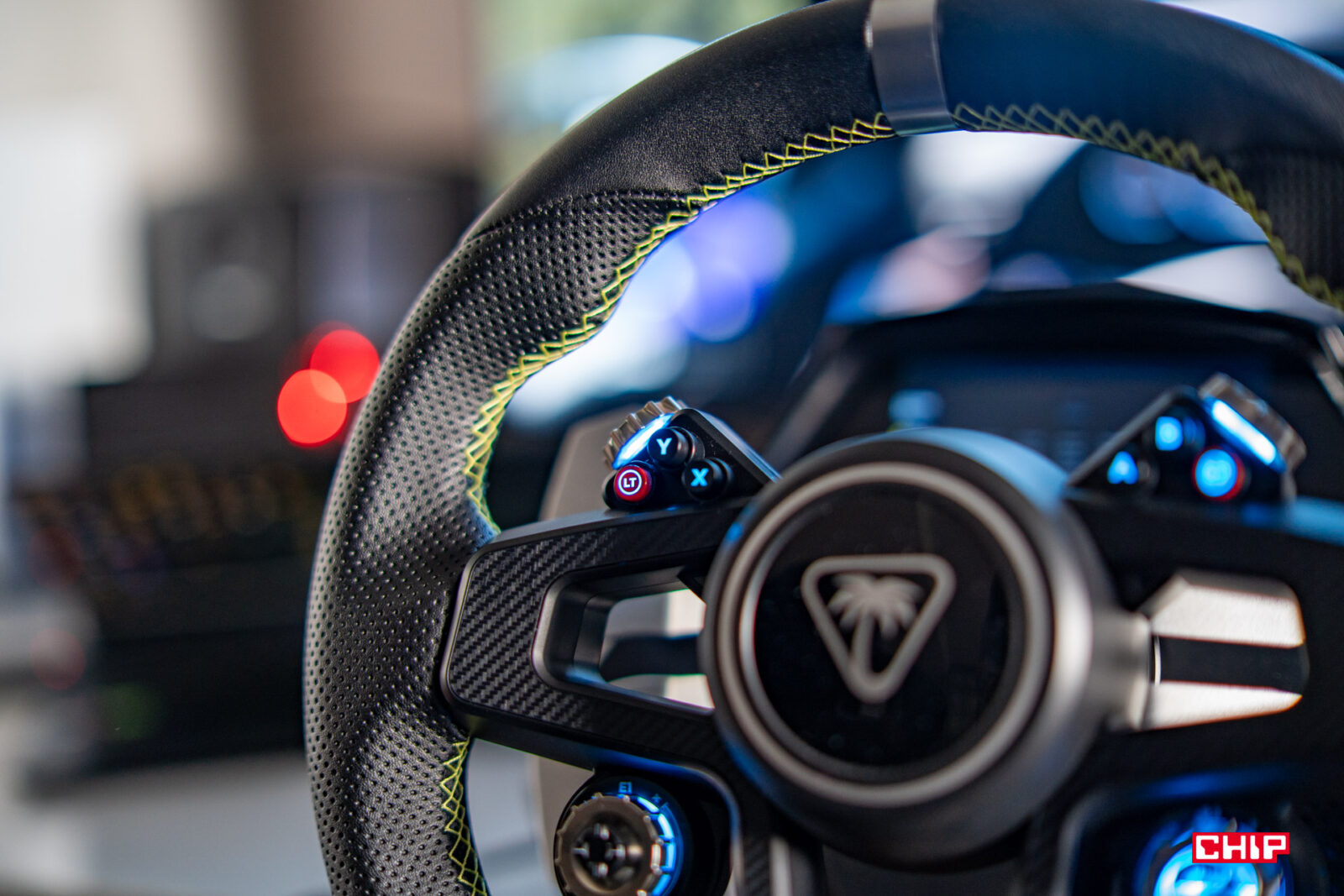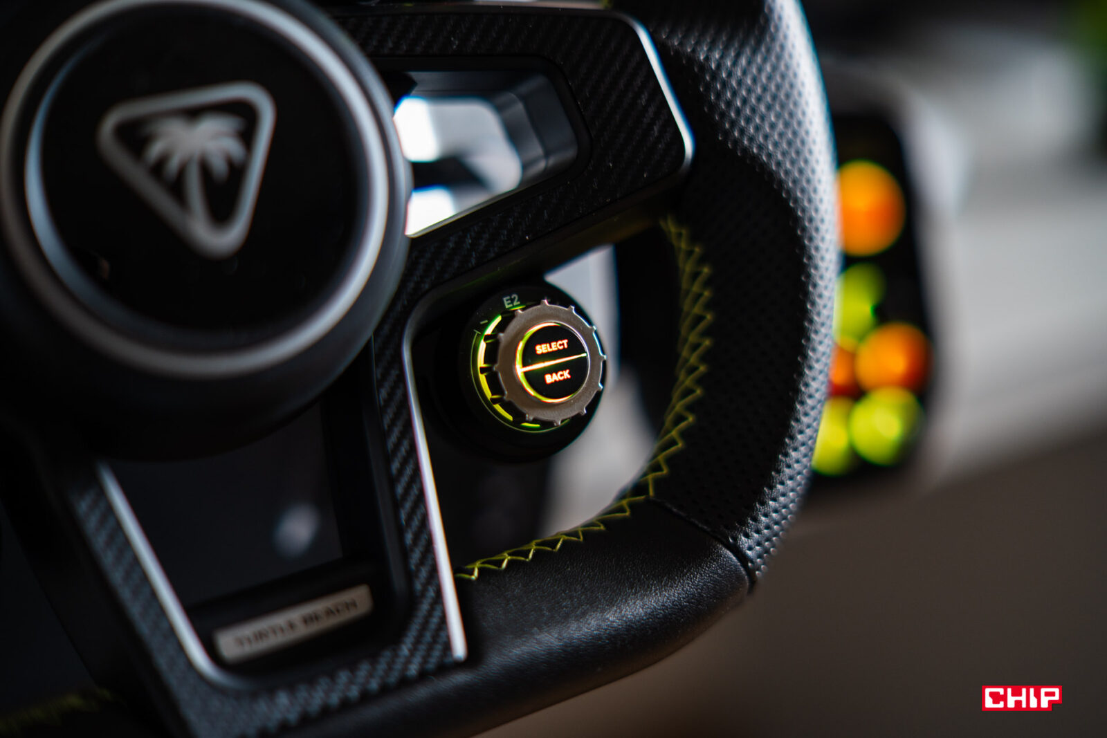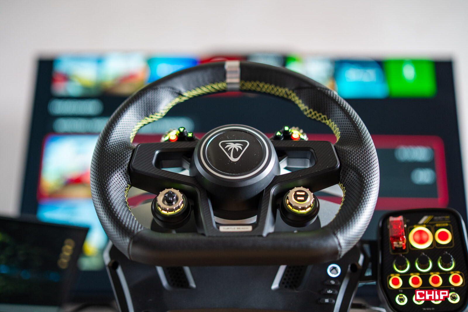 Turtle Beach VelocityOne Race składa się z ogromnej wręcz liczby przycisków. Na przodzie kierownicy mamy nieco zmodyfikowany, ale klasyczny układ przycisków pada Xboxa. Czyli XY i LT oraz AB i RT w górnej części, Select/Back oraz D-Pad w dolnej. Te dodatkowo są otoczone pokrętłami. Dwa kolejne pokrętła znajdziemy na górnej części środka kierownicy, a z tyłu chowają się aż cztery łopatki.