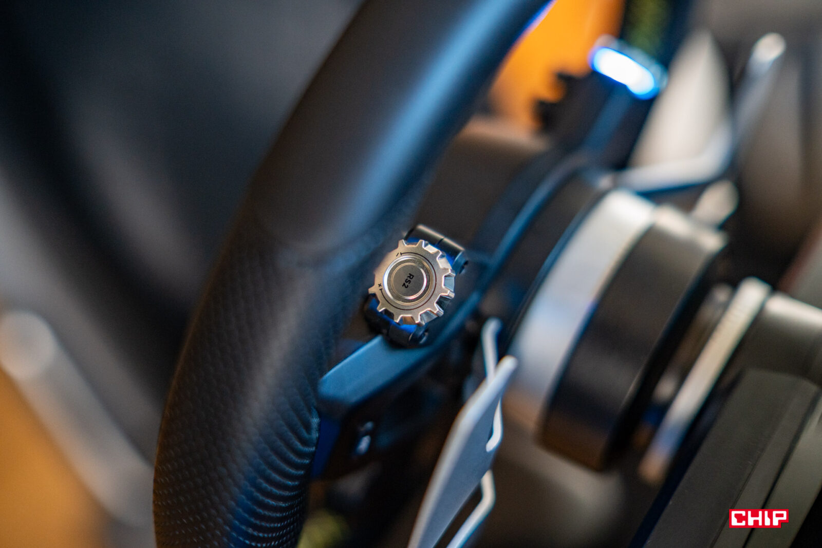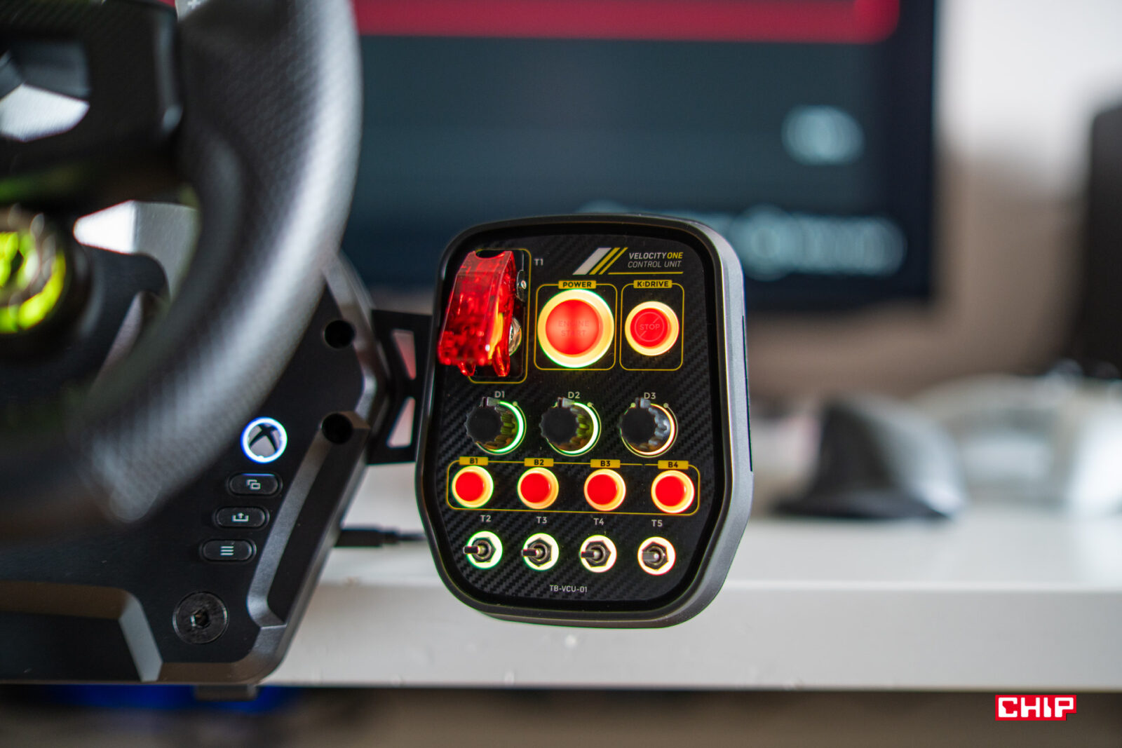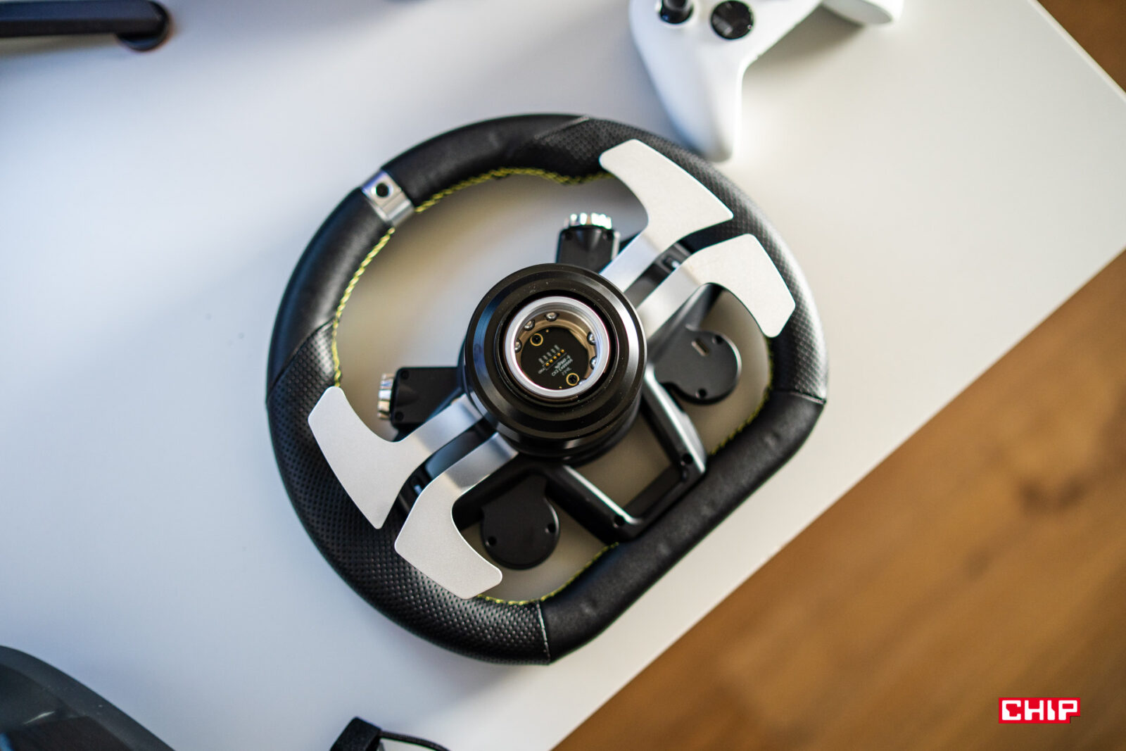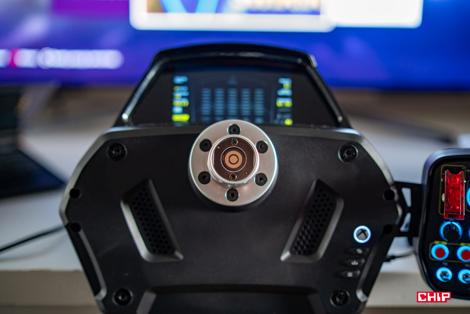 Powyższe elementy wystarczają do podstawowego sterowania kierownicą, ale dodatkowo mamy cały dołączany panel. Tutaj znajdziemy trzy pokrętła, cztery guziki, cztery przełączniki oraz jeden wielki przełącznik rodem z Szybkich i Wściekłych. Wszystkie te elementy możemy dowolnie personalizować i przypisywać do nich całą masę różnych funkcji.