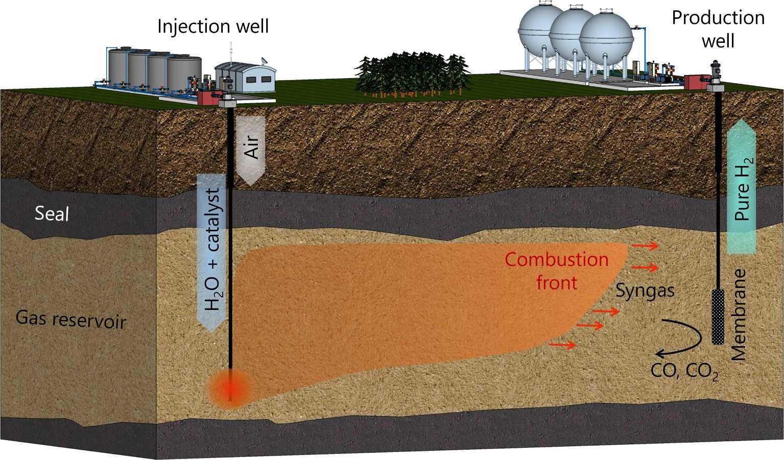 Następnie wprowadzi się do złoża gazu ziemnego tlen lub powietrze, celem zapalenia gazu jeszcze pod ziemią. Reakcja ta wspomagana parą wodną i katalizatorem doprowadzi do oddzielenia się wodoru od pozostałych składników, czyli tlenku węgla i dwutlenku węgla. Na sam koniec wydobędzie się z pułapki gazowej jedynie wodór. Przepuści się go przez specjalną membraną, blokując drogę dla CO i CO2, które celowo zdeponuje się w zamkniętym podziemnym złożu.