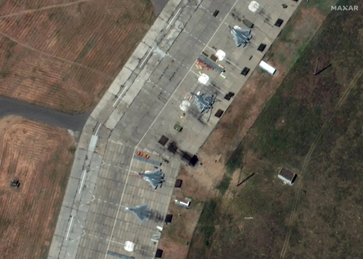 Dziś mamy już dostęp do nowych zdjęć satelitarnych jeszcze lepszej jakości, które przedstawiają aż trzy myśliwce Su-57 Felon w rosyjskiej bazie, którym towarzyszy namalowana na asfalcie makieta, pełniąca rolę wabika. Poniżej możecie obejrzeć zdjęcia “przed i po” ataku, które jednoznacznie wskazują, że Su-57 znajdujący się między dwoma innymi myśliwcami tego samego typu, został uszkodzony. Nic nie wskazuje na bezpośrednie trafienie w myśliwiec, ale widoczne po lewej stronie od kadłuba kratery sugerują jednoznacznie, że wygenerowane od eksplozji odłamki podziurawiły poszycie samolotu, co sugeruje również zakrycie części kadłuba akurat po tej stronie jakąś białą płachtą.