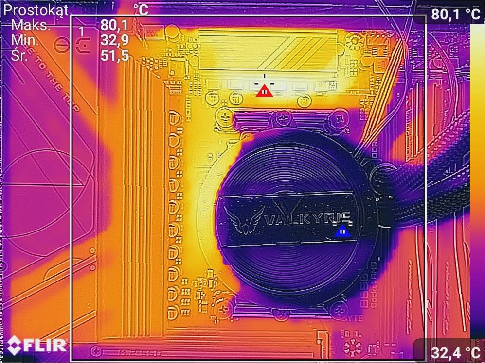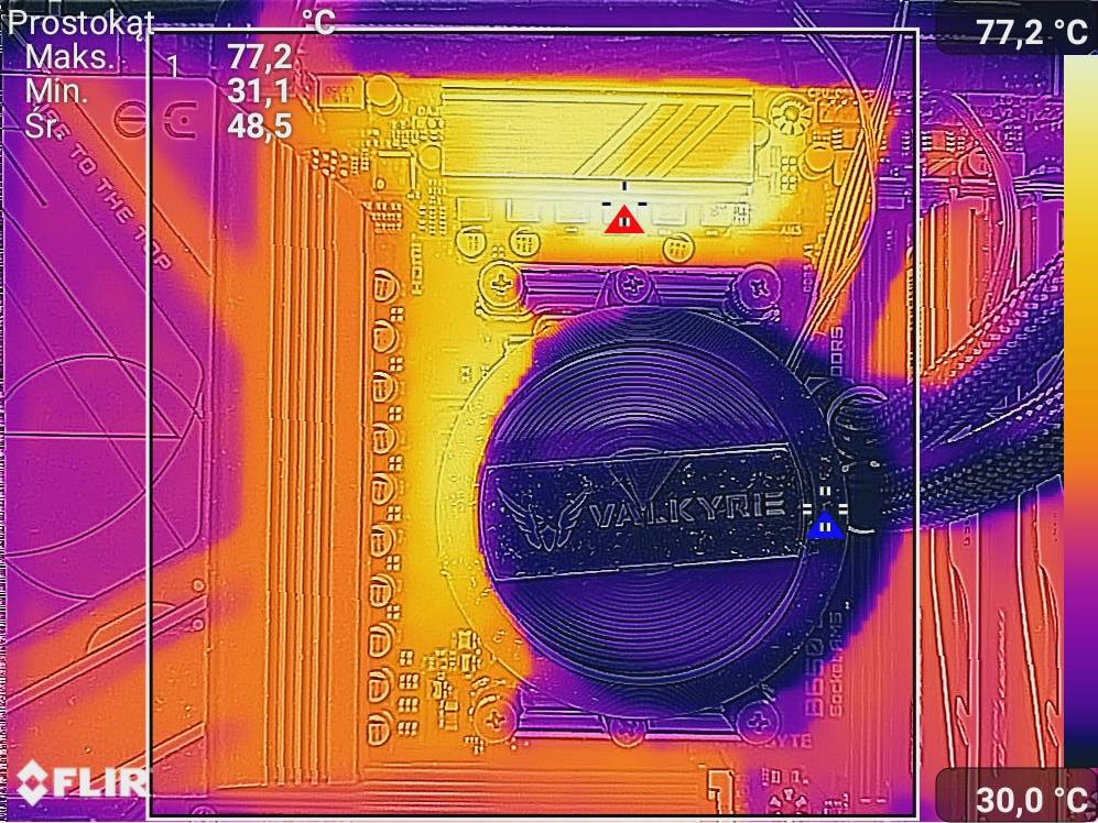 Czujnik na płycie wskazywał kolejno 67°C i 73°C. Płyta spokojnie radzi sobie z najmocniejszym procesorem AMD po jego podkręceniu. W obudowie z dobrym przepływem powietrza będą jeszcze niższe temperatury. Może nie jest najzimniej spośród wszystkich testowanych płyt AM5, ale jak na budżetową konstrukcję jest naprawdę dobrze.