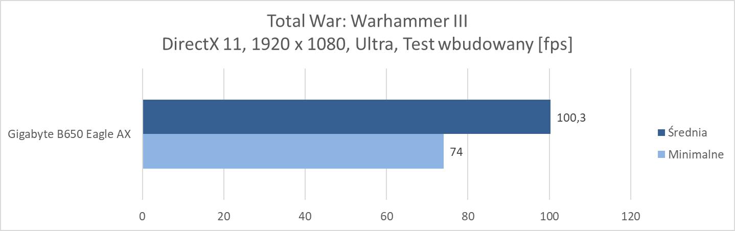 Na koniec przeprowadziłem testy w trzech grach: Total War: Warhammer III, Far Cry 6 oraz Metro Exodus Enhanced Edition. Testy wykonałem w rozdzielczości 1920 x 1080 px przy najwyższych ustawieniach. Wyłączyłem tylko ray tracing oraz DLSS/FSR, jeśli dana gra miała takie opcje. Testy przeprowadziłem przy wykorzystaniu wbudowanych w gry benchmarków. W przypadku Total War był to benchmark Mirrors of Madness.
