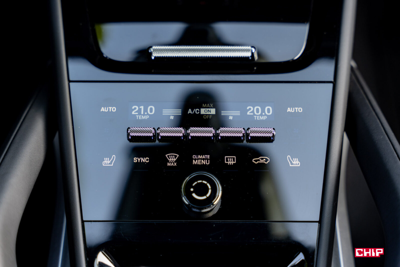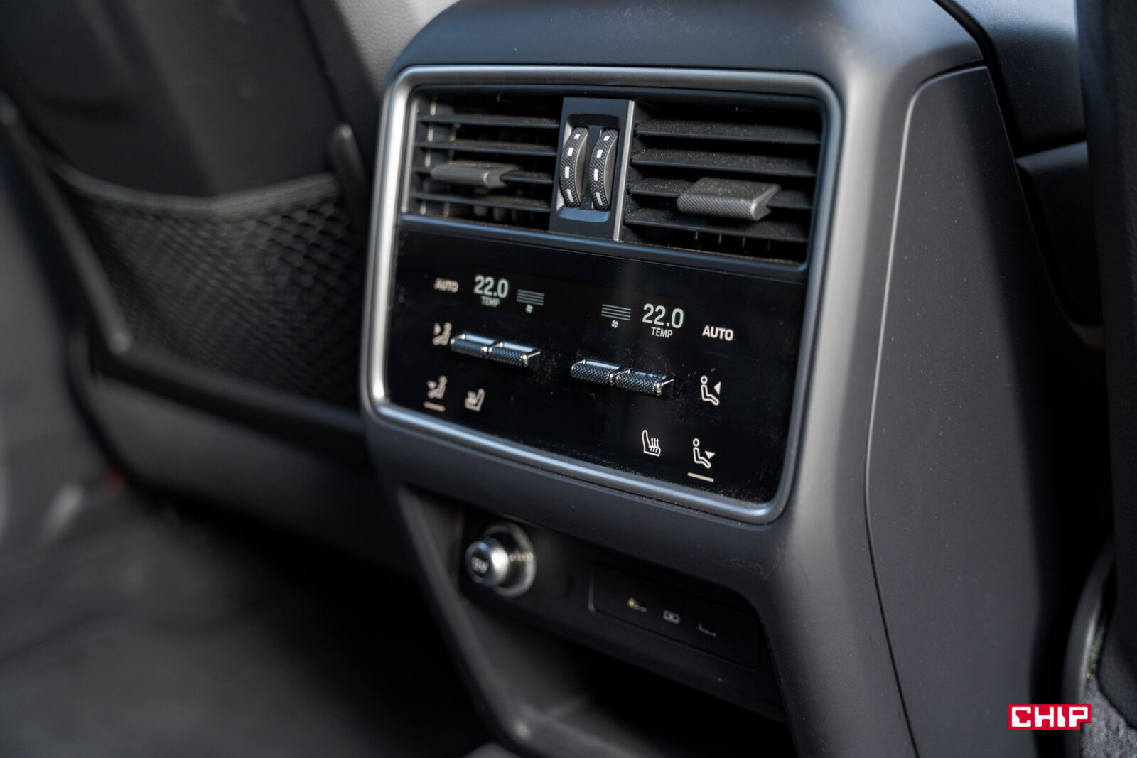 Wracając do panelu regulacji klimatyzacji. Aż chce się zapytać, kto to tak koncertowo spier… Błyszczy się to, rysuje, zbiera kurz, odbija słońce i dosłownie potrafi oślepić w trakcie jazdy. A to do tego to przedziwnie działa. Z jednej strony mamy fizyczne przełączniki, z drugiej przyciski są ukryte w całym panelu. Nie są to pola czułe na dotyk, a zwyczajnie musimy go wcisnąć, co przechyla cały wielki kawał plastiku na boki. To nie koniec, bo jeśli przykładowo nie kupiliśmy wentylowania przednich foteli, to guzik od tej funkcji jest tam widoczny, ale nie można go wcisnąć i nie jest podświetlany. W całym tym naprawdę pięknym wnętrzu to zwyczajnie straszy.