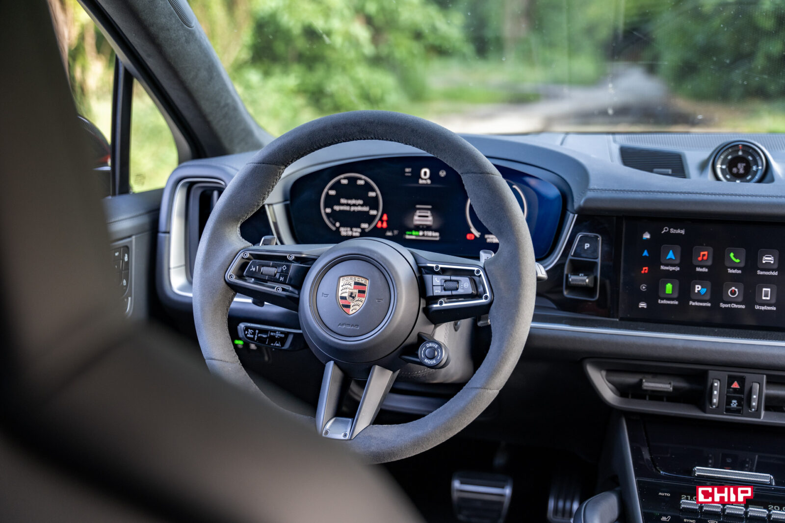 Jeśli mimo wszystko komuś zabraknie mocy, to na kierownicy mamy atomowy przycisk znajdujący się pośrodku pokrętła zmiany trybów jazdy (a tych trochę jest, samych hybrydowych mamy trzy). Cayenne przez 20 sekund zachowuje się wtedy, jakby ktoś go kopnął w tyłek i przypalał opony, a lekkie naciśnięcie gazu wystrzeliwuje go do przodu. Szkoda tylko, że sam przycisk wygląda bardzo niepozornie i można go niezauważyć.