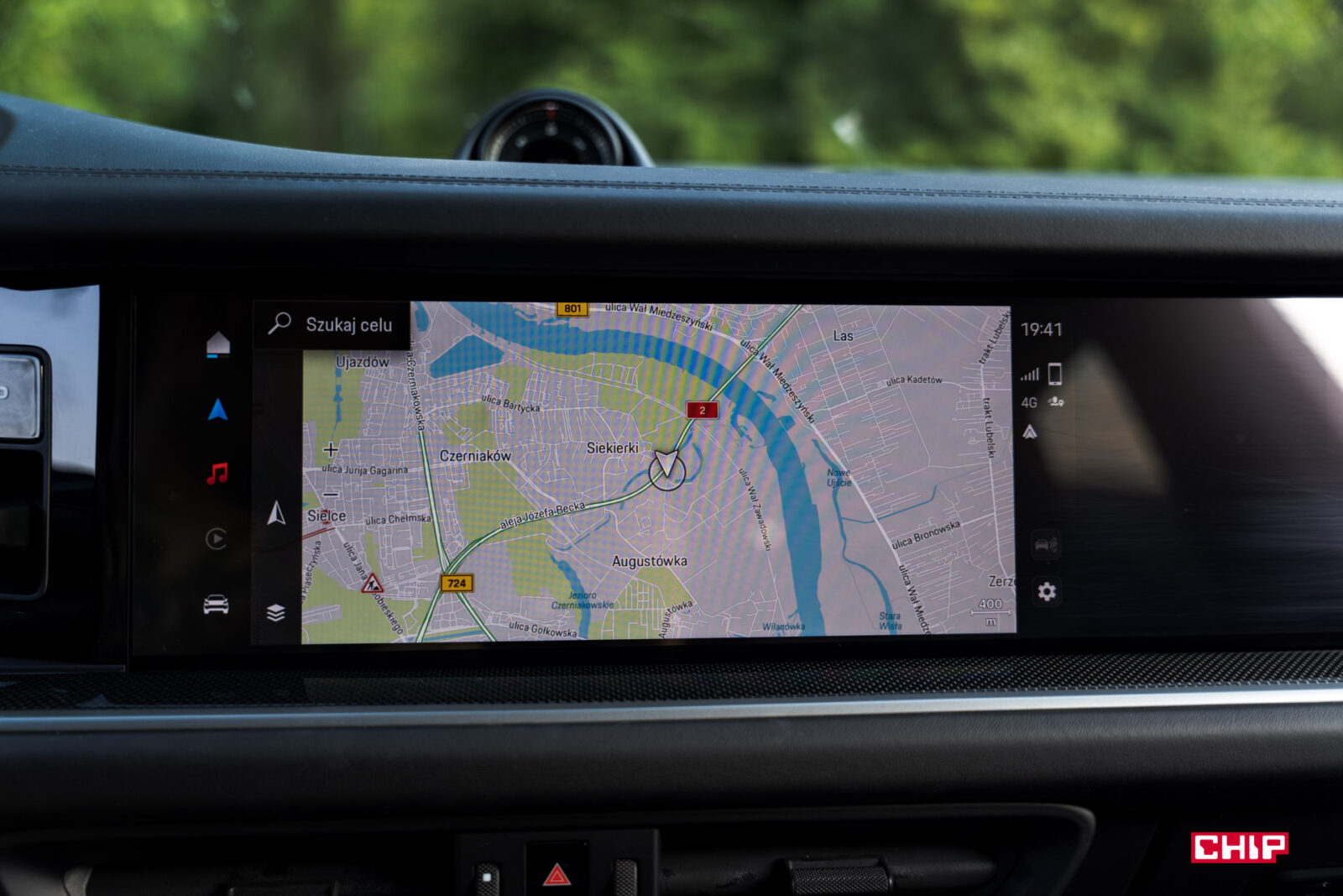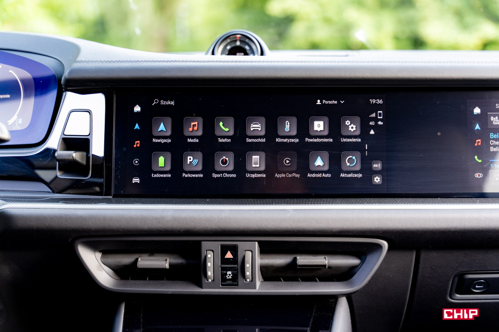 Opcjonalnie możemy mieć ekran pasażera, którym Porsche pokazuje np. Mercedesowi, jak powinno się go robić. Nie wiem, czy to kwestia odpowiedniej powłoki czy samej folii na ekranie, ale wyświetlacz dodatkowy jest widoczny tylko dla pasażera. Kierowca widzi czarną plamę i nie może zobaczyć, co się na nim wyświetla. A pasażer może w tym czasie oglądać film. Naprawdę czapki z głów!