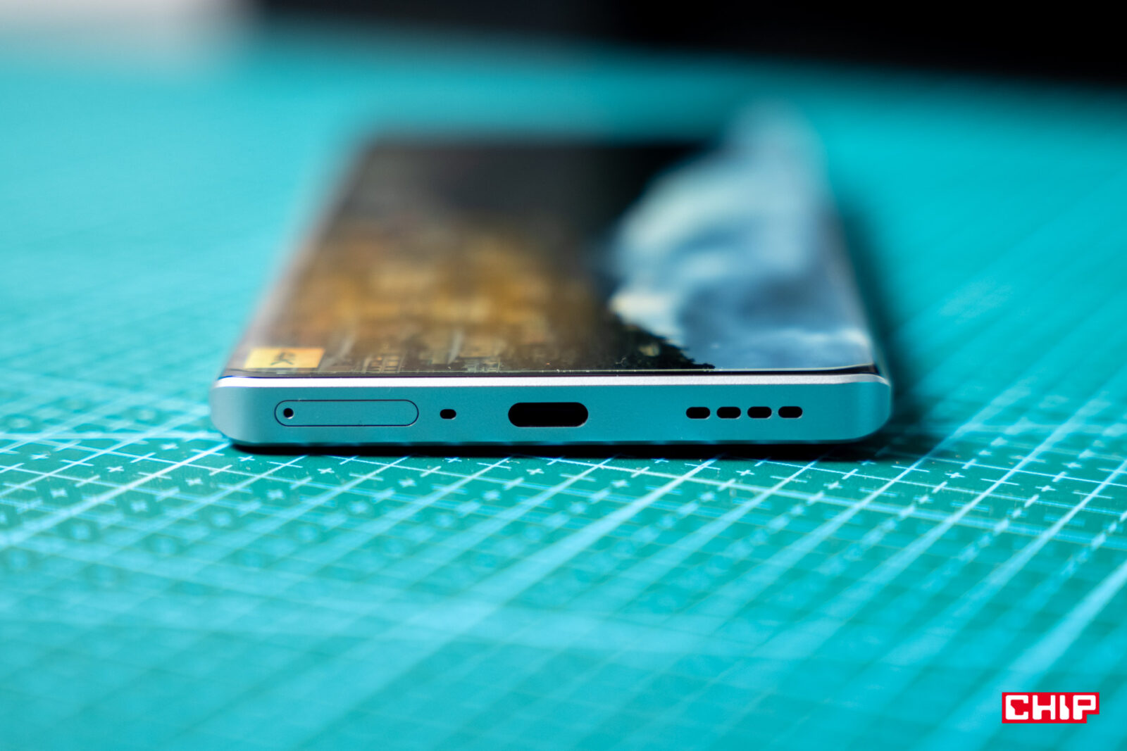 Oczywiście tworzywo znajdziemy nie tylko z tyłu, ale i w bocznych ramkach obudowy. Po prawej umieszczono przyciski głośności oraz włącznik. Tu pozytywne zaskoczenie – spodziewałem się przycisków słabo osadzonych i gibających się na boki, a tu skok jest przyjemny i niemal nie ma ruchów poza obrys. Lakier nie starł się przez kilka tygodni poza jednym miejscem, na które telefon upadł. Na dole znajdziemy maskownicę głośnika, port USB-C oraz tackę na dwie karty Nano SIM. Boki są też nieco płaskie, ale ze ścięciami dość głęboko przechodzącymi do tafli szkła. Te nie są ostre i nie wbijają się w ręce.