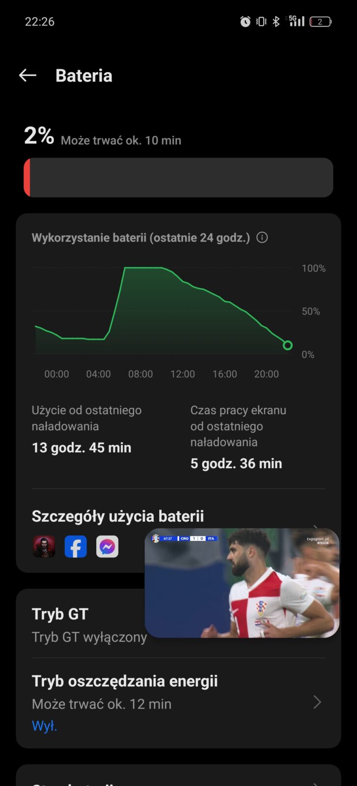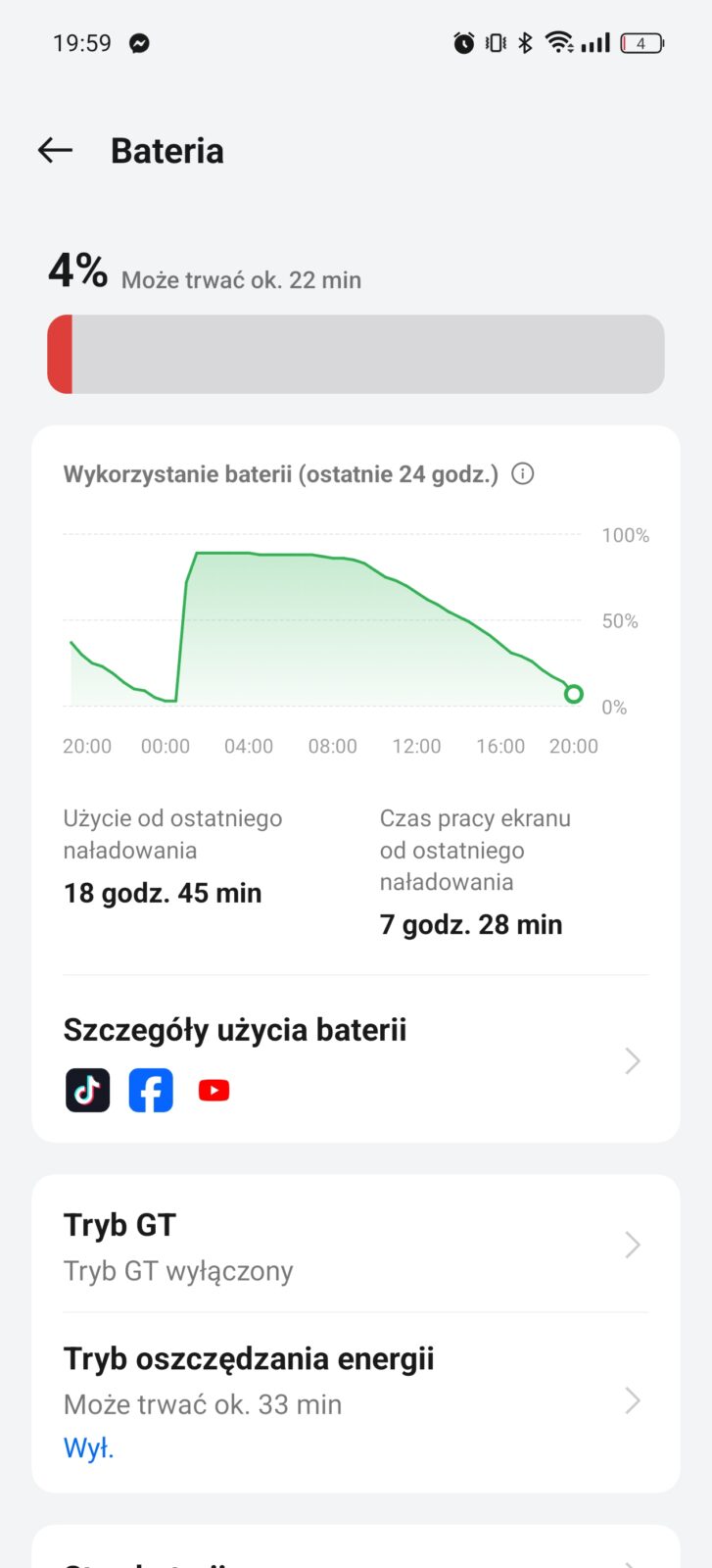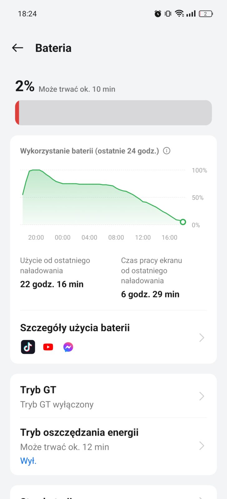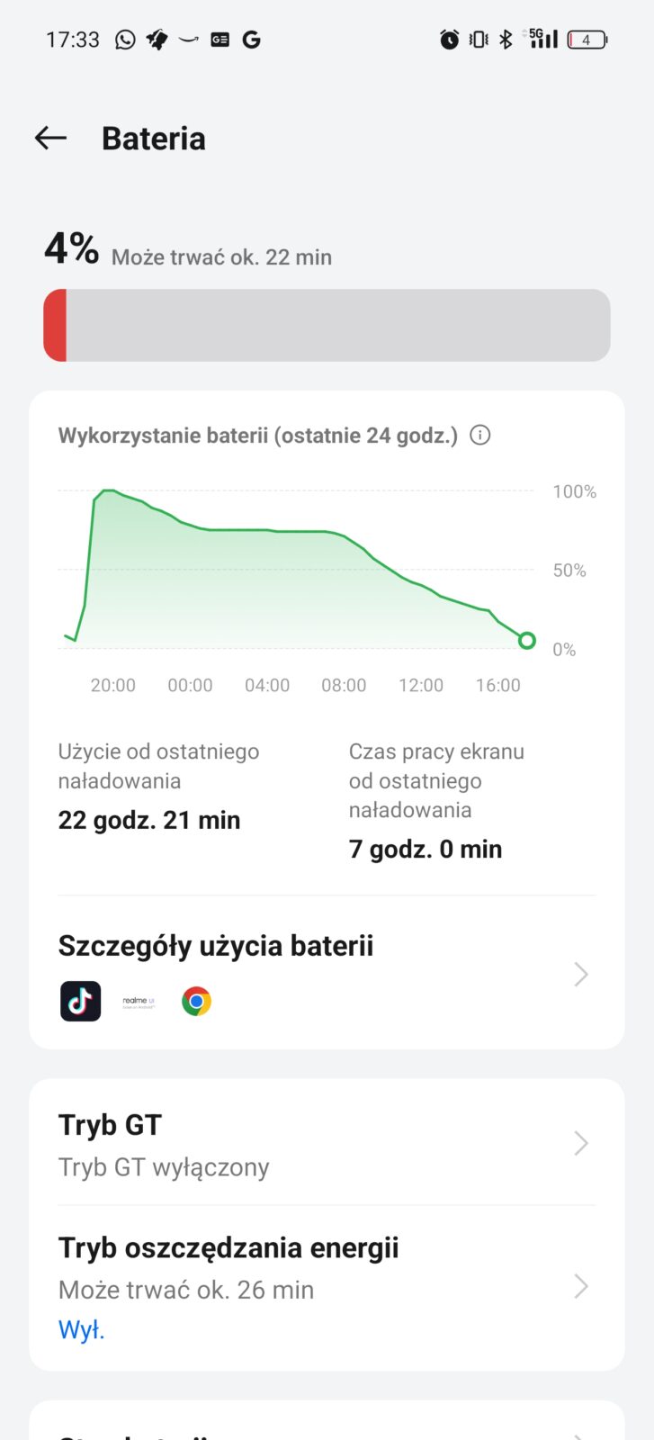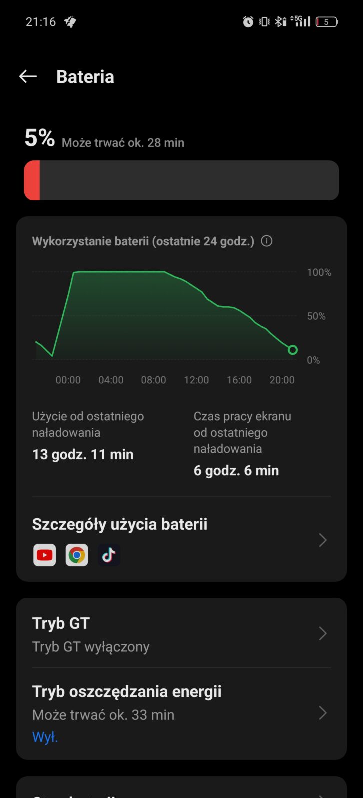 Trzeba docenić, że realme GT 6T bez większej obudowy czy zwiększonej masy dostarczył akumulator o pojemności 5500 mAh. To więcej od konkurencji o około 10%, ale czy czasy pracy są dłuższe? Niekoniecznie. Na LTE/5G osiągałem czasy bliższe 5,5-6 godzinom na ekranie, a na samym Wi-Fi osiągnąłem maksymalnie 7,5 godziny. Takie wyniki, osiągnięte głównie przy korzystaniu z mediów społecznościowych, odpisywaniu na wiadomości i oglądaniu Youtube przełożyły się na pełny dzień pracy, choć nie widzę przeciwwskazań, by były to dwa mniej intensywne dni.