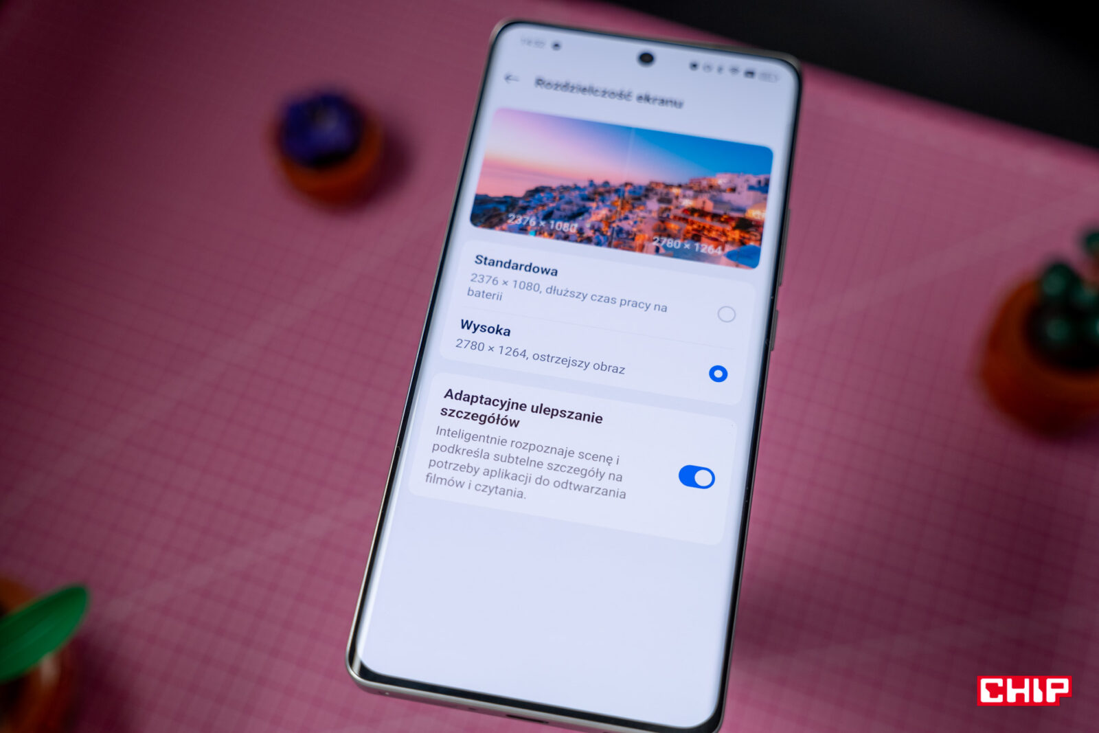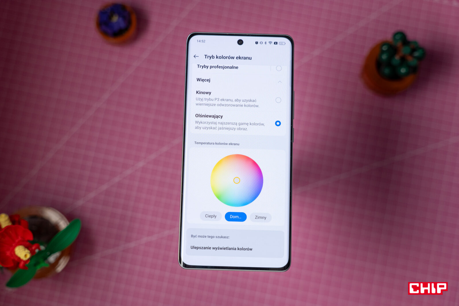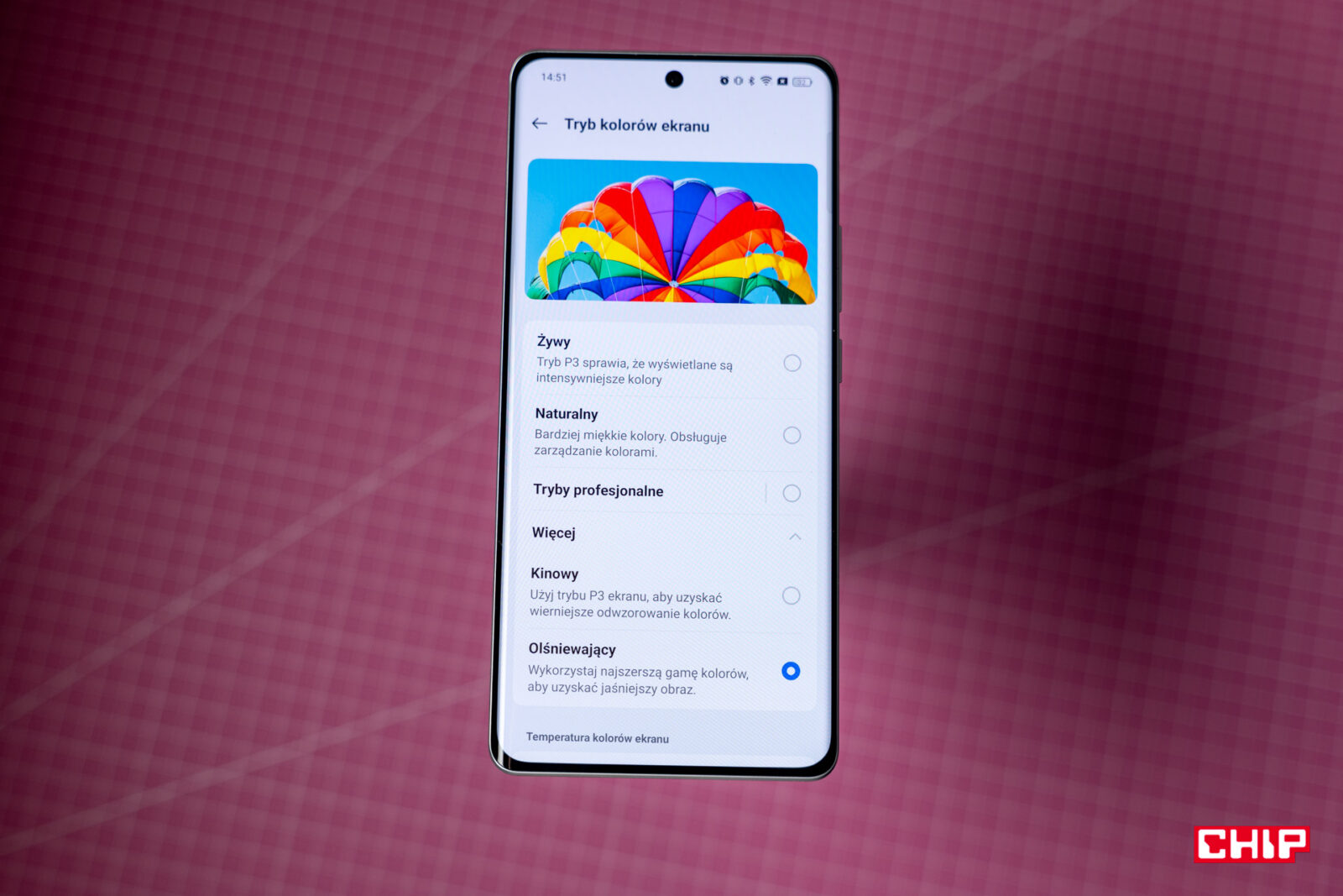 Maksymalna jasność w trybie HDR wynosi 3100 nitów i to najwyższy wynik, jaki osiągnąłem w testach smartfonów w tym roku. To jednak niejedyny parametr, w którym realme GT 6T uderza konkurencję mocniej niż moglibyśmy się spodziewać. Poza wysoką jasnością maksymalną na co dzień, smartfon wyświetla albo bardzo stonowane, albo nasycone kolory. W systemie nie brakuje opcji regulowania tych barw pod nasze preferencje, a do tego przygotowano kilka gotowych opcji.