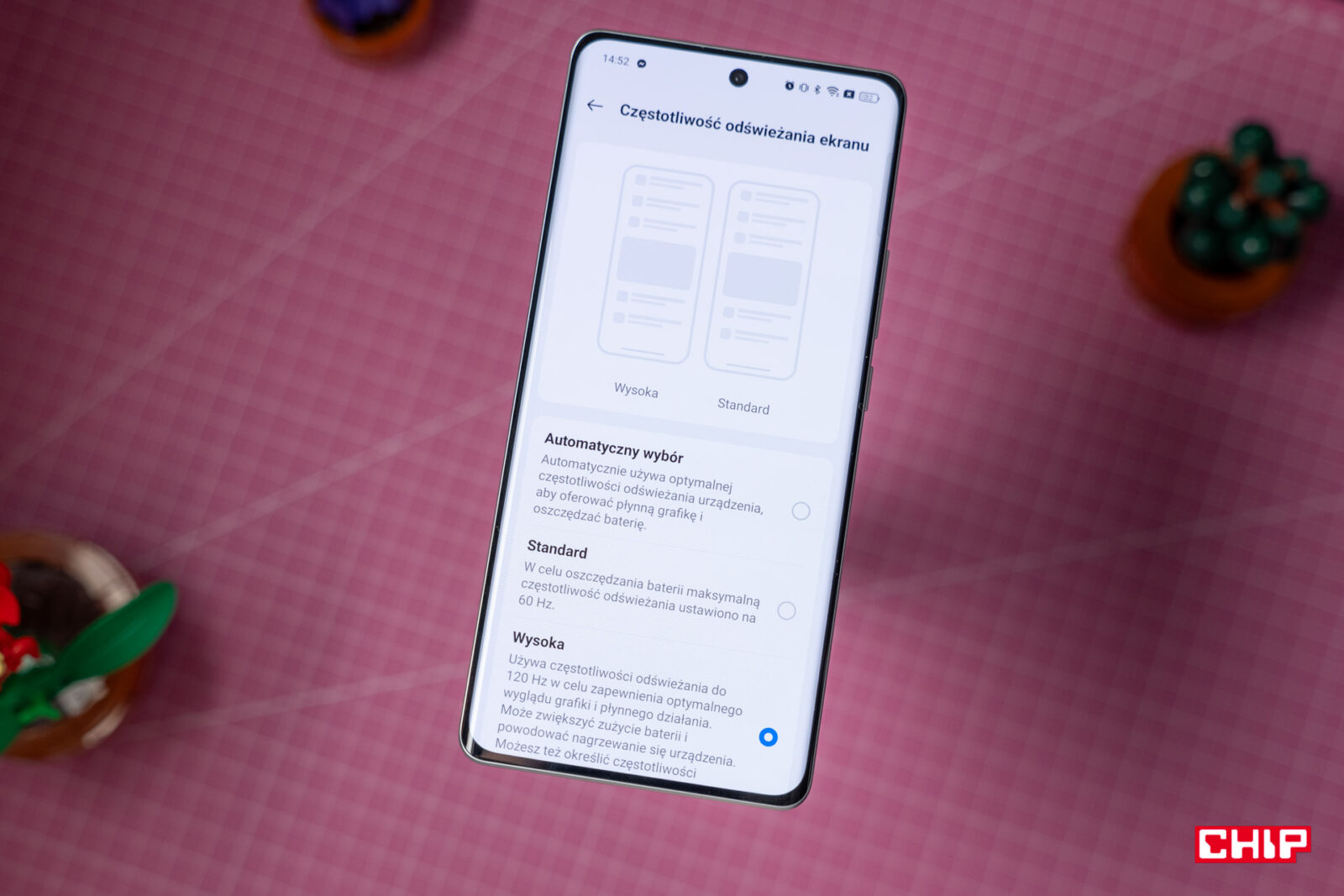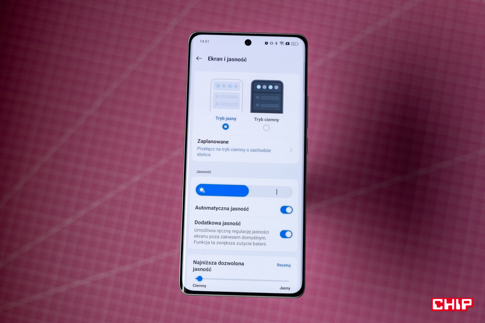 Czyżby realme zrobiło z ekranem coś, czego nikt się po nich nie spodziewał? Producent postawił na nieco wyższą niż standardowa rozdzielczość – 2780×1264 pikseli (450 ppi) – oraz na dużą przekątną – 6,78 cala. Zastosowana technologia to LTPO AMOLED, a więc odświeżanie zmienia się między 1 a 120 Hz. Producent chwalił się też jasnością na poziomie 6000 nitów – tę jednak osiągał niewielki fragment ekranu przy wygaszeniu reszty.
