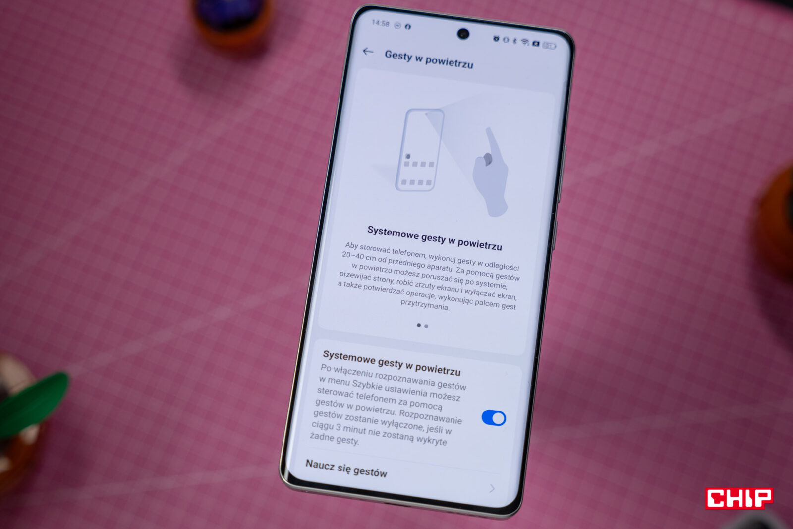 Za ciekawostkę uznaję gesty w powietrzu – przedni aparat wykrywa naszą dłoń i umożliwia w ten sposób przewijanie zawartości ekranu bez dotykania telefonu. Byłoby to rozwiązanie użyteczne, gdyby działało niezawodnie, ale jednak jest na tyle irytujące, by pozostało przede wszystkim ciekawostką. Oprócz tego są tu znane dodatki od realme jak boczny pasek z propozycjami aplikacji i czynności, ale i opcją przypinania wybranych programów czy szybkie uruchomienie, które po odblokowaniu ekranu palcem pokaże obok niego skróty, do których wystarczy przeciągnąć. Są tu też sprytne funkcje, jak robienie zrzutu ekranu po przeciągnięciu trzema palcami w dół lub podzielenie ekranu między aplikacje po przeciągnięciu nimi w górę.