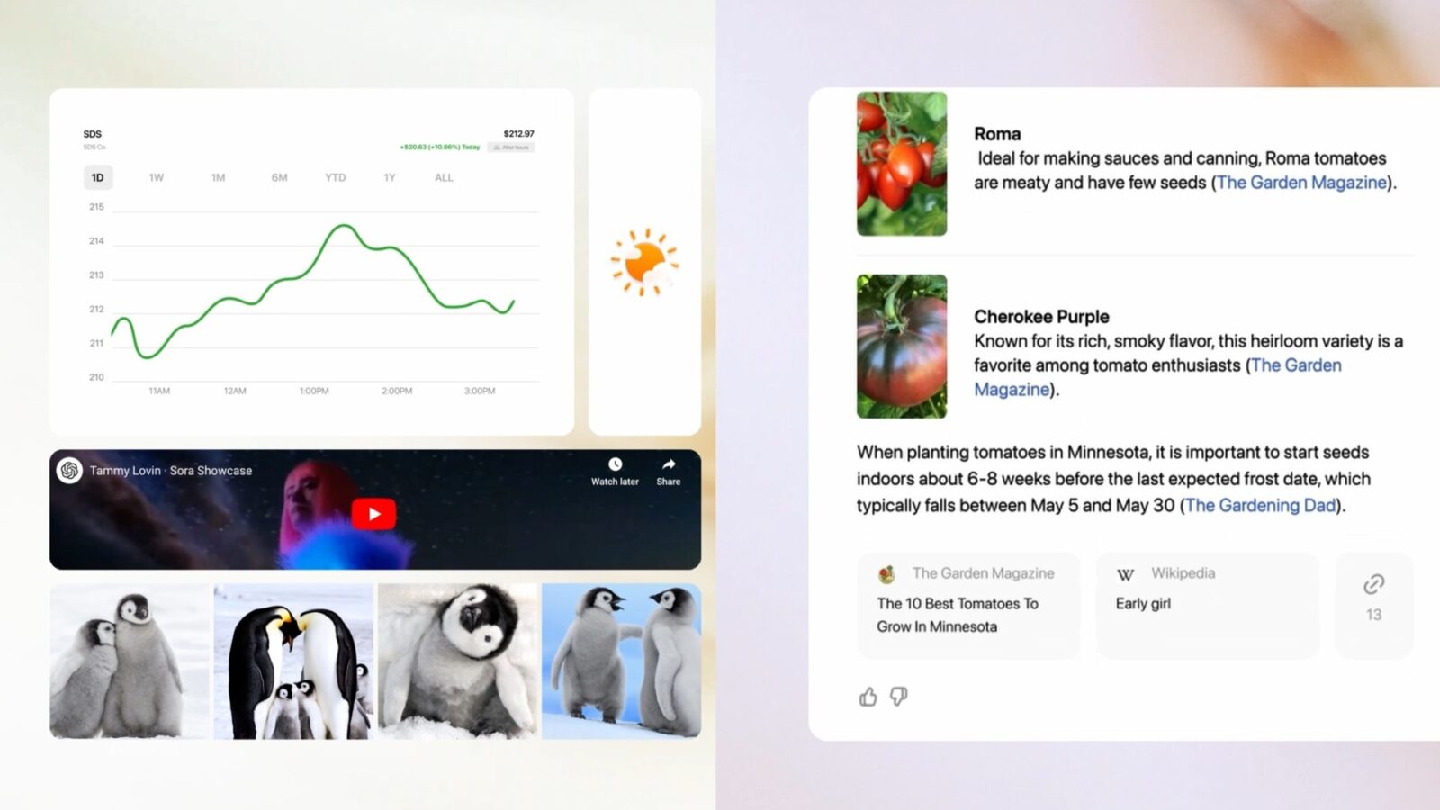 Wyszukiwarka została podzielona na trzy sekcje. W pierwszej możemy prowadzić rozmowę i nawiązywać do poprzednich zdań. W drugiej znajdziemy linki do stron odnoszące się do naszego wyszukiwania. Trzecią część stanowią odpowiedzi wizualne. To, jak prezentuje się ta zakładka, na ten moment jest tajemnicą, ale według artykułu TheVerge możemy spodziewać się bloków, które korespondują z tematem zarówno na poziomie treści zdjęcia, jak i mogą być grafikami pokazującymi pogodę czy dane z giełdy.
