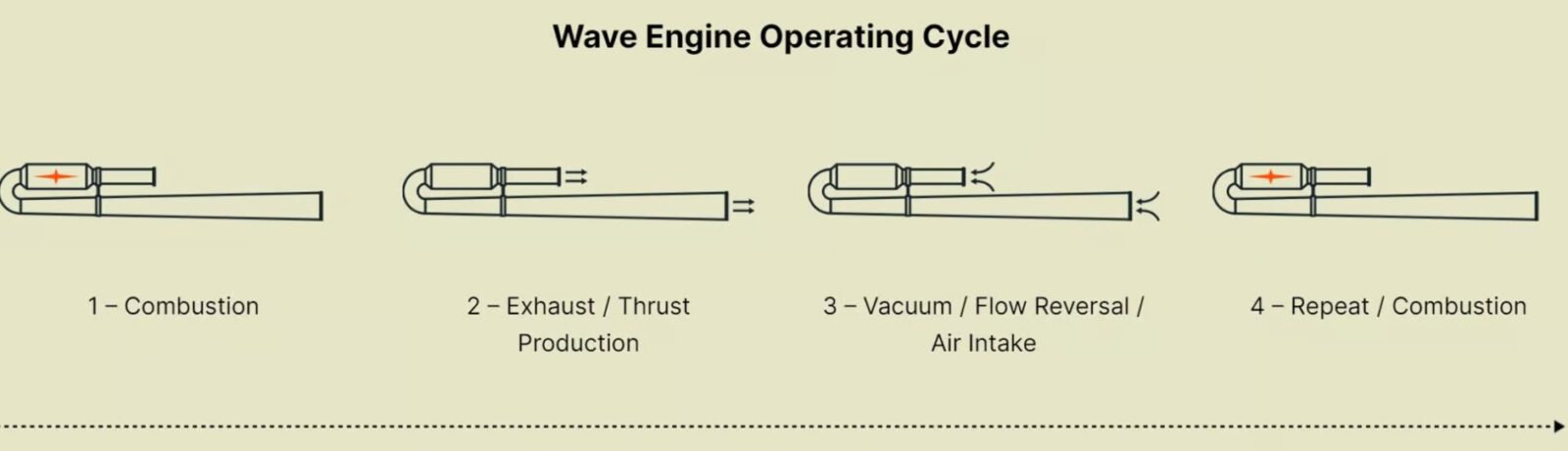 W przeciwieństwie do tradycyjnych silników odrzutowych złożonych z ruchomych komponentów, silnik pulsacyjny firmy Wave eliminuje całkowicie potrzebę stosowania ruchomych części. Zamiast tego opiera się wyłącznie na falach ciśnienia napędzanych spalaniem, które wypychają gorące gazy i tworzą ciąg. Proces spalania odbywa się przerywanie, bo gdy paliwo i powietrze zapalają się w komorze, zwiększając temperaturę i ciśnienie, co wypycha gorące gazy z obu końców rury, generując tym samym ciąg. Ten proces powoduje częściową próżnię, która wciąga świeże powietrze z zewnątrz, rozpoczynając cykl na nowo dla następnej sekwencji spalania.