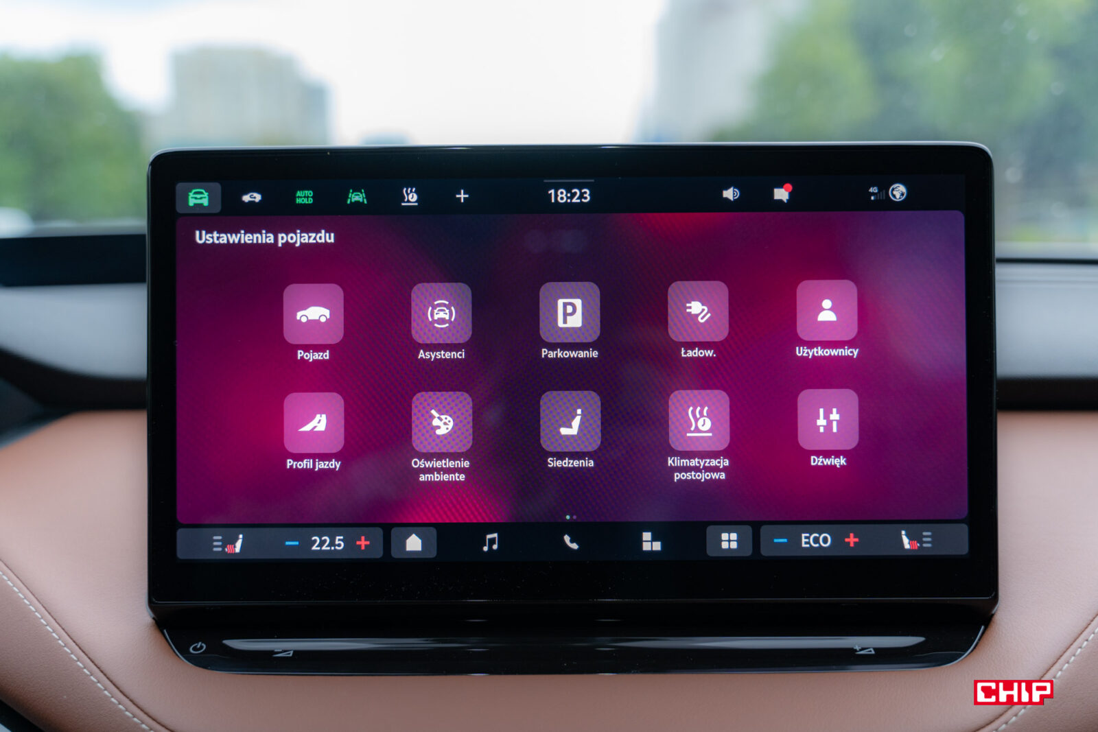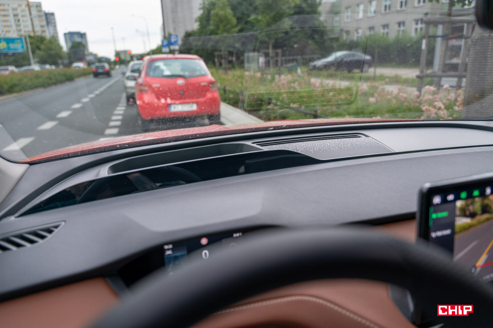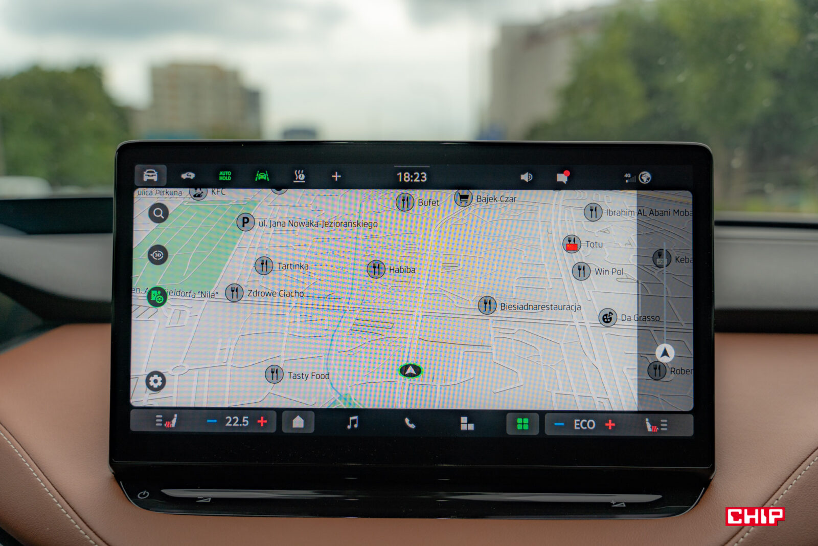 Sam interfejs jest czytelny i prosty w obsłudze. Co ważne, choć jest taki sam jak w Volkswagenach ID, działa nieporównywalnie lepiej. Tutaj nic się nie wiesza, ani nie każe na siebie czekać. Szkoda tylko, że regulacja głośności odbywa się za pomocą dotykowych pól pod ekranem, ale do dyspozycji mamy kilka fizycznych przycisków.