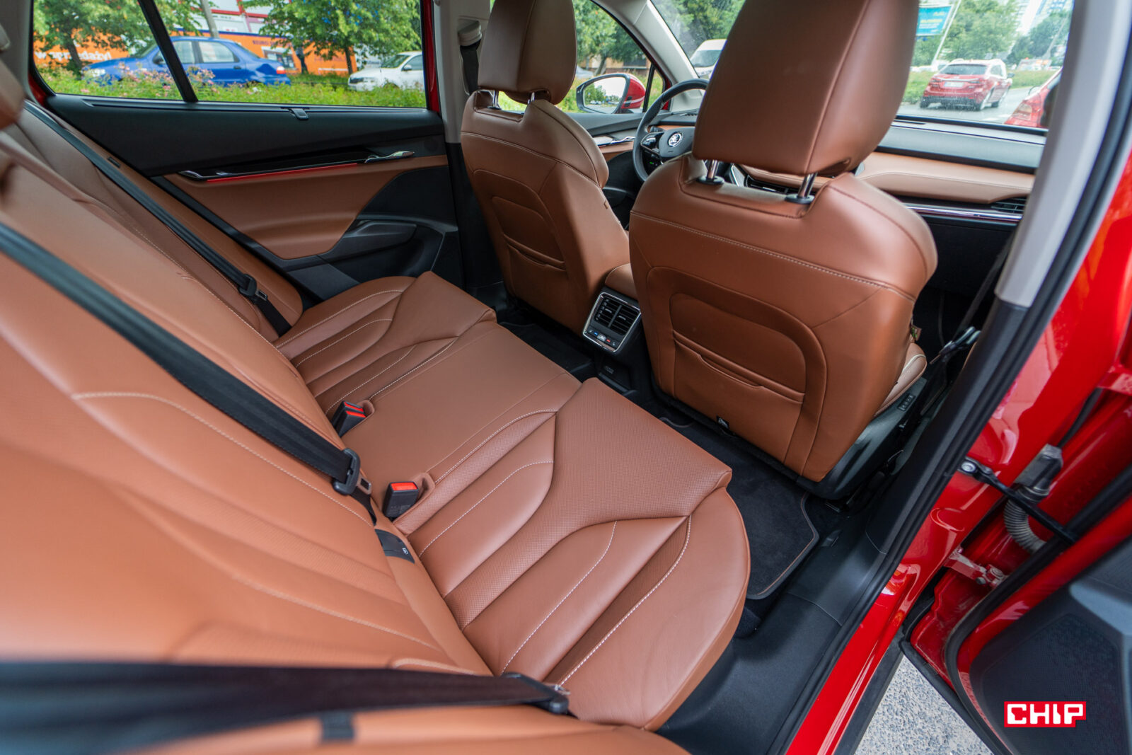 Jak to w Skodzie, mamy tu dużo nietypowych, ale przemyślanych dodatków. Jak przegródki na monety w tunelu środkowym, które jak są puste strasznie się brudzą. Mamy dodatkowy schowek na lewo od kierownicy, uchwyt na długopis w głównym schowku, uchwyt np. na identyfikator na przedniej szybie czy opcję demontażu przegródek na tunelu środkowym z tyłu. Co ułatwia wpakowanie tam trzech osób.