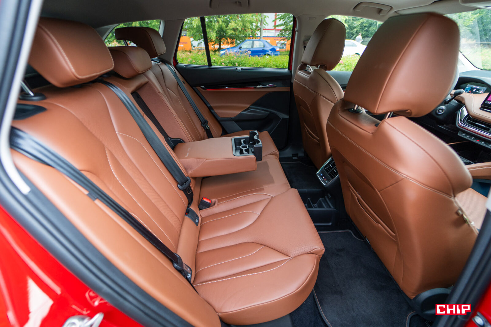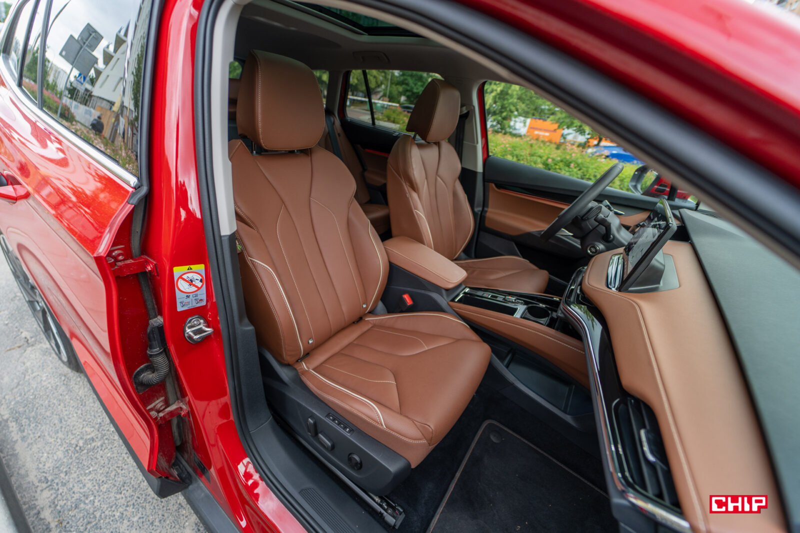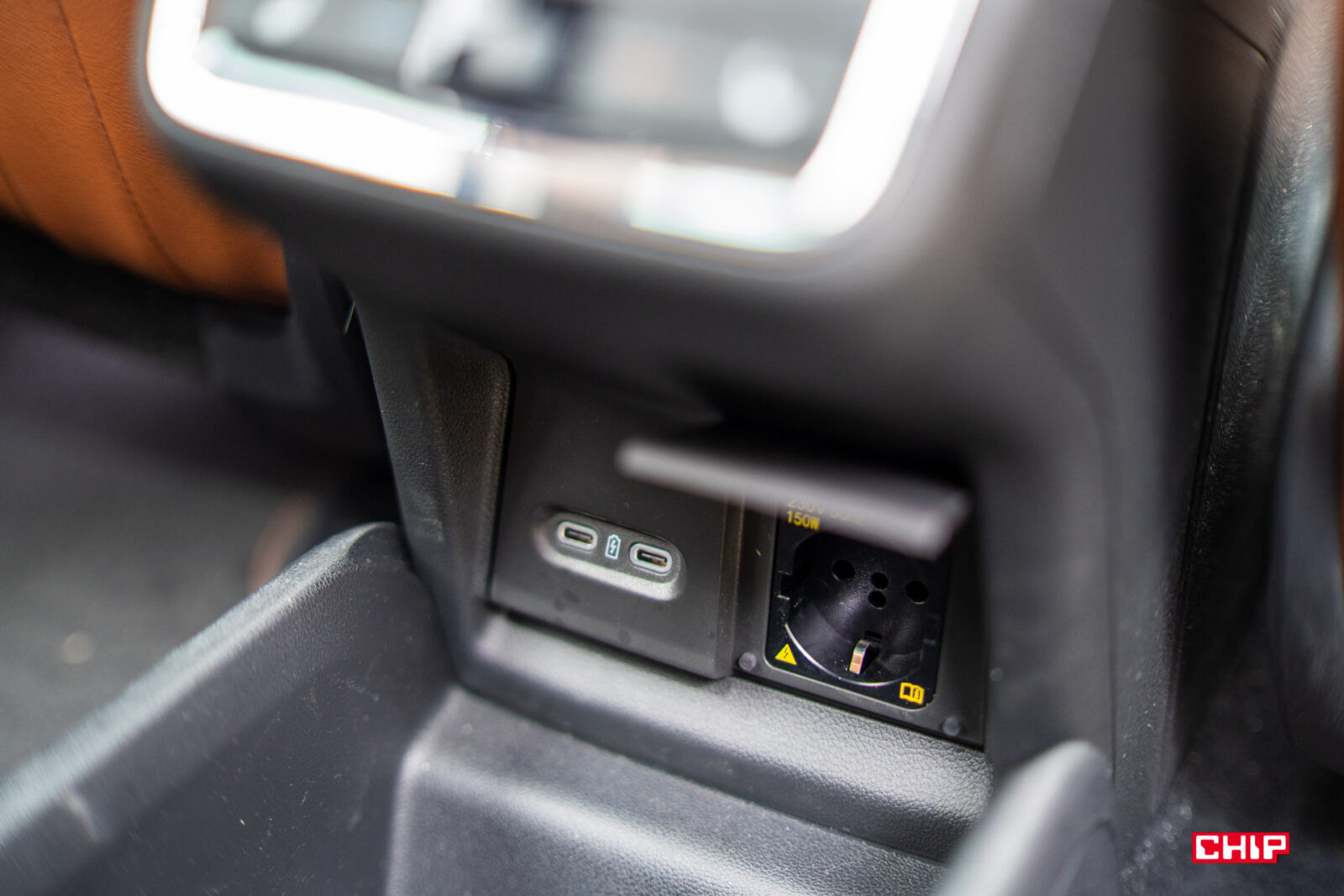 Pomimo tego, że deska rozdzielcza jest ogromna i bardzo mocno wystaje do wnętrza, Enyaq jest przestronnym autem. Jeśli siedząc z przodu spojrzymy przez ramię to dosłownie końca nie widać. Nie inaczej jest z tyłu, gdzie mamy dużo miejsca na nogi i nad głową. Dodając do tego wygodne fotele i tylną kanapę, to idealne auto na dłuższe podróże. Taki żarcik przy elektryku… Pasażerowi ze tyłu mają dostęp do portów USB-C, panelu sterownia klimatyzacją oraz gniazdka 230 V o maksymalnej mocy 150 W. Brawo!